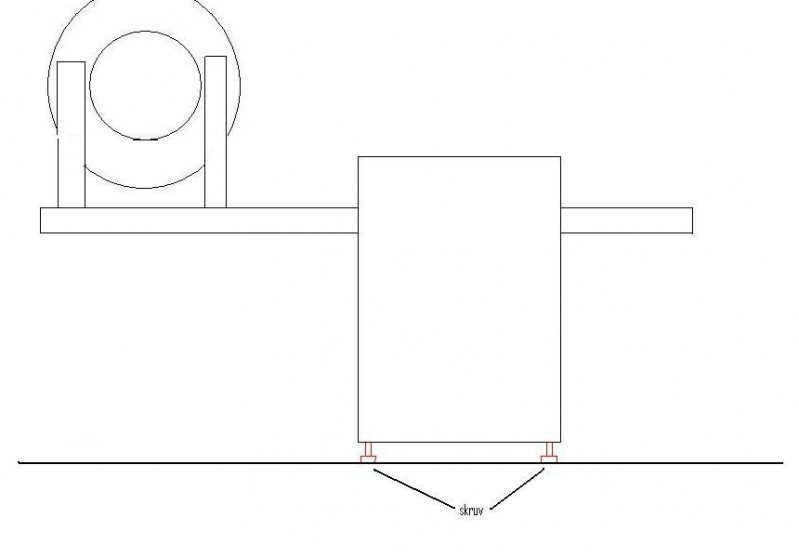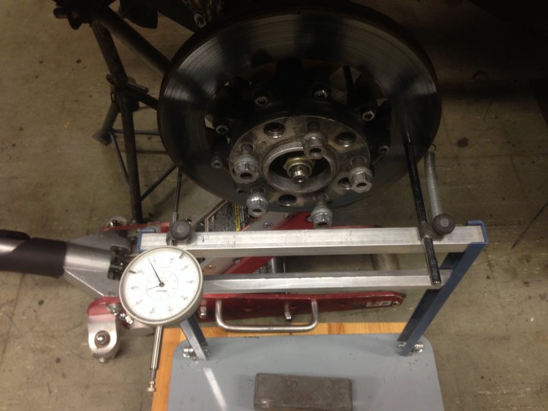 Det blir lite för många fel-källor med mått som ska vägas mot något annat...för att få det man vill ha. I ditt exempel, skulle spårviddsförändringen vara 3 mm när klockorna visar lika. Alltså noll bump. Om du mäter på samma bil med lite bump.....kan du verkligen få 3 och 4 mm ? Eller blir det 2 och 4 mm. Vad är då bumpsteer-storleken ? 1 eller 2 mm ? Använder du 1 eller 2 mm för att räkna ut hur många grader du har i bumpsteer..??? Det jag vill säga, är att man mäter med en metod som inte påverkas av en massa andra rörelser. Man sätter alltså en rak profil på tex bromsskivan och lutar sedan en stadig skiva mor profilen. Profilen följer alltså skivan, när man hissar/sänker spindeln, utan att spårviddsförändringen påverkar resultatet. Vill man sedan utveckla detta med en klocka som visar bumpen..så må det vara hänt. Man kan även använda dyra, blanka matrial i profil och skiva, om man vill. Men för att beskriva funktionen, är det lättare att använda fyrkantsprofil och spånskiva som exempel. Med denna metod kan man även flytta ut mätningen ur hjulhuset, om det är för trångt där inne. Tex så här.