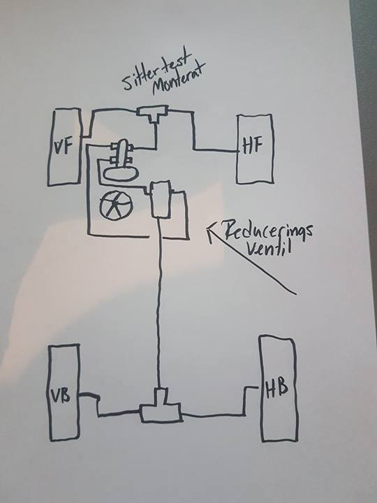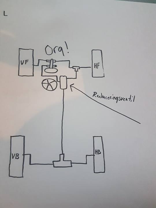 Som du har ritat det original, bör det bara kunna vara en differenstrycksventil (kretsvarningsventil) som inte kopplar samman de två separata kretsarna (fram/bak) eftersom man i så fall "kortsluter" systemet och i praktiken har enkrets bromssystem. Kretsvarningsventilen har en "kolv" mellan de två kretsarna, tanken är att den förskjuts till en sida om trycket i kretsarna är olika (=läckage i en krets). Kolven ska då tända en varningslampa. Ibland är kretsvarningsventilen kombinerad med en reducering, men inte alltid. Jag rekommenderar att man i ett specialbygge tar bort kretsvarningsventilen (den behövs inte om man har genomsynliga bromsvätskebehållare eller nivågivare i behållarna), och tar bort kopplingen mellan de två kretsarna (som Cammo ritat). Oftast får man då sätta in en ny reduceringsventil till bakre kretsen. Kretsvarningsventilen är lurig för det händer att man råkar trycka över kolven åt ett håll (till exempel när man luftar systemet, speciellt om ena kretsen är tom/har mycket luft) och då kan kolven fastna i ett läge där den stryper eller påverkar balansen i systemet. Jag har också varit med om att man råkar koppla kretsvarningsventilen fel, så att man "kortsluter" kretsarna av misstag. Alltså, ta bort den och koppla enkelt så lär det fungera. Gustaf _________________ ---/In search of Maxwell's demon---/ Egentligen heter jag Gustaf Ulander - men therealpinto är väl vad folk känner till... SFRo-besiktningsman i Skellefteå |