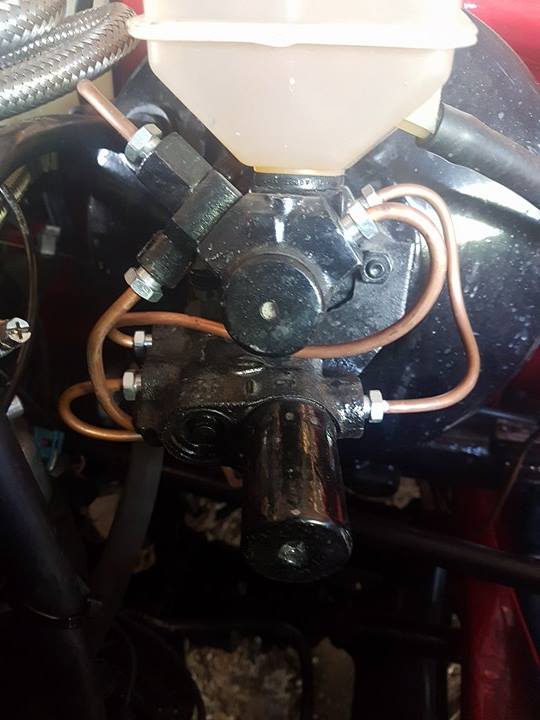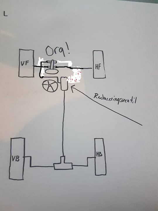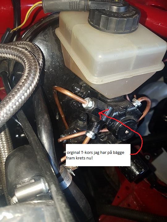 här ser du ventilen under huvudbromscylindern, får se vad du tror om det? kan köpa det du säger med å koppla bort ventilen, men jag har satt 1 bromsrör till bägge fram? tycker jag bör ha lika mkt tryck åt bägge hållen isf? men jag ska testa så ni har målat upp det å se om det hjälper, jag har en ställbarventil liggandes i garaget, dock är den justerbar så antar det blir svårt att ställa in rätt tryck? men det kanske SBP kan hjälpa mig att ställa in?