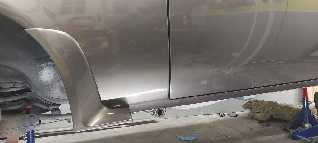 sidokjolen har varit sprucken och haft lite konstig form. så tänkte laga den men,, men dom hade limmat fast den ett helvete att få av den , och den var så dålig, av på 5 ställen och lagad med sådan väv man har på väggarna. så letade upp en beg , var bättre men krävde mycket plastande , men blev bra och spacklad och slipgrundad och lackad med 2k sprayprodukter från tipro , blev väldigt bra , monterade även blindnitmuttrar i tröskeln så den blir enkel att motera istället för orginal dåliga lösning , med platpluttar och är även jättedyra idag har knappt kört något i sommar då det varit så tråkigt väder , hoppas på bättre snart nästa jobb blir nog frambromsarna alla delar finns hemma