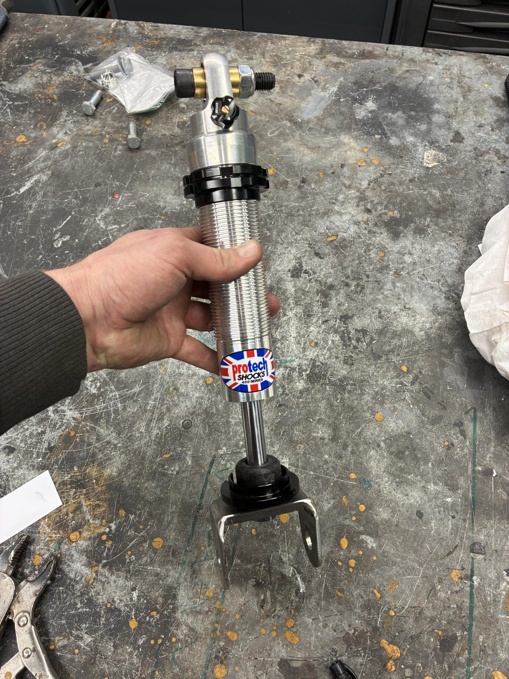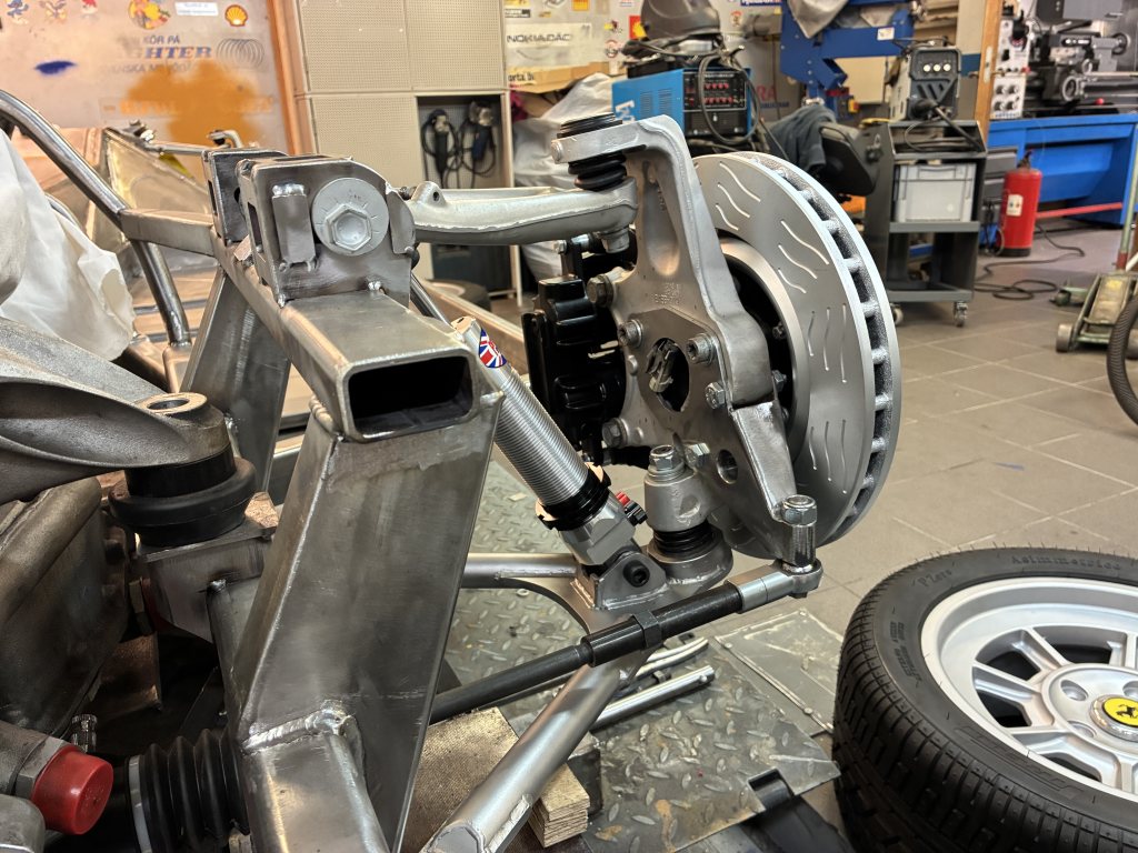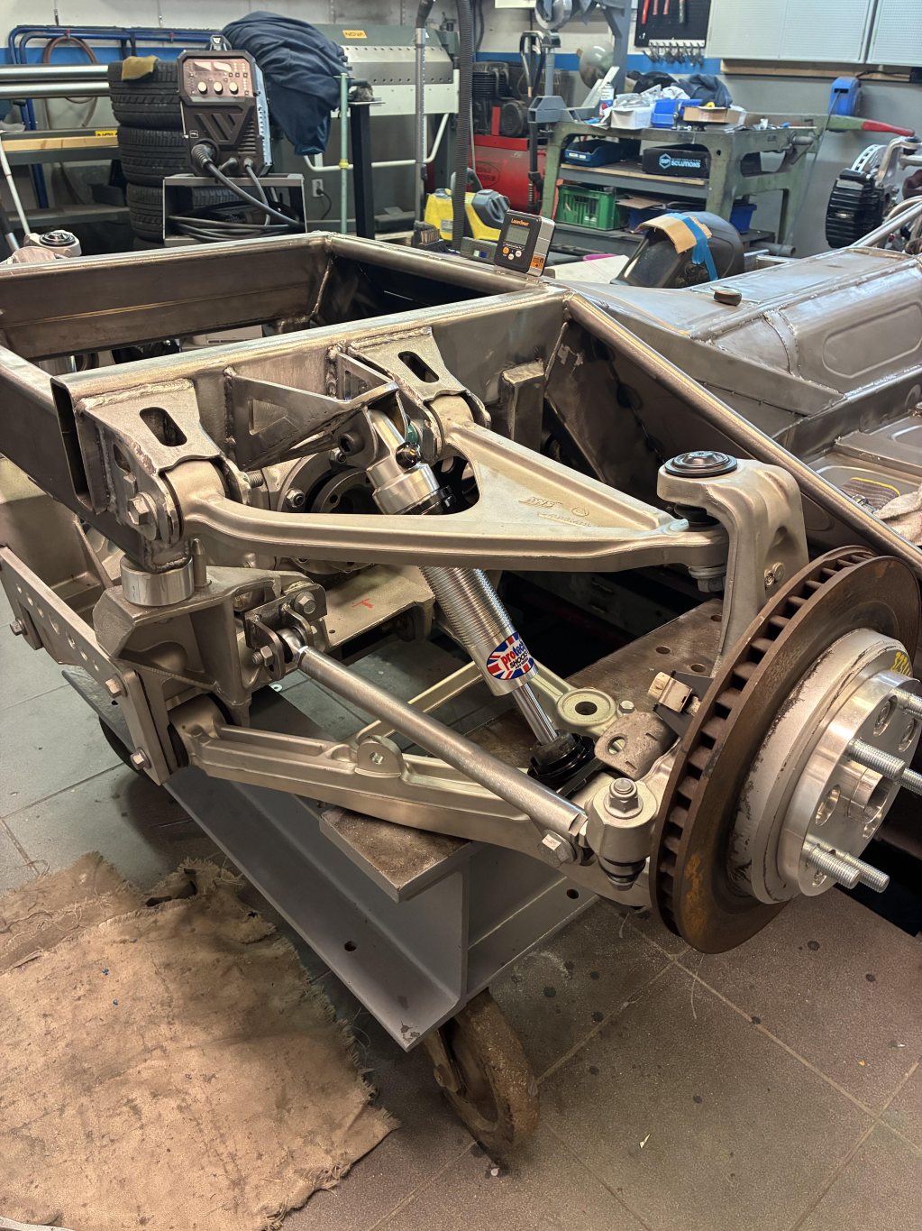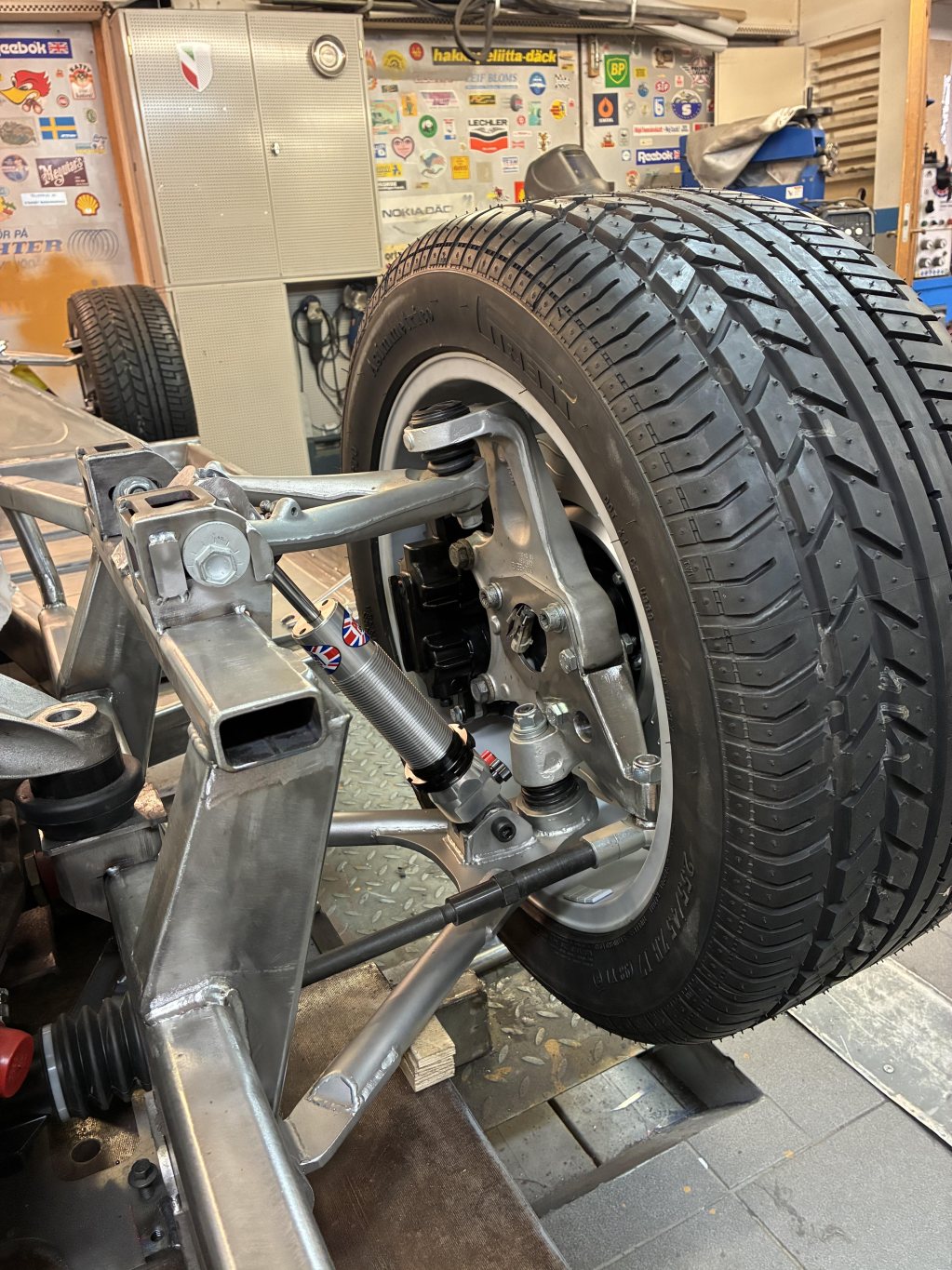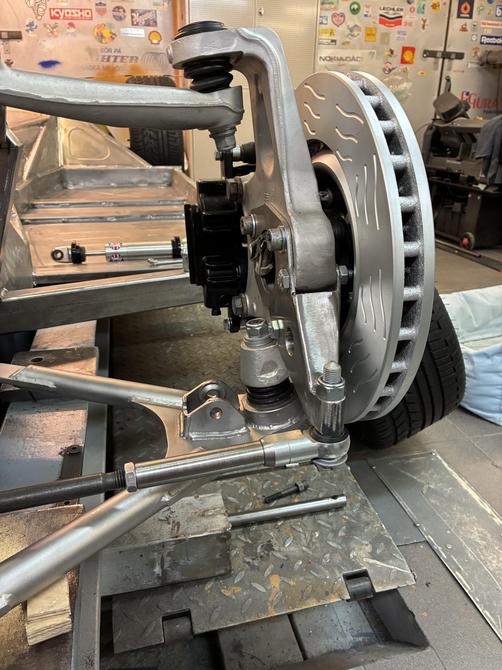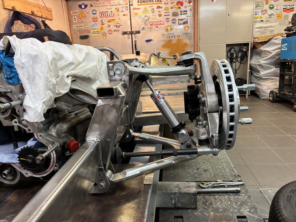 Några timmar till på bygget, ser nästan ut som sist dock. Insåg att jag tyckte att diffen hamnande för högt i bakvagnen och bestämde mig för att dels sänka bakre subframen och även sänka ner den ytterligare i själva bryggan. Oavsett massa jobb för att komma tillbaka till punkt 1. Beställde även en uppsättning protech dämpare till bakvagnen som monterades up side down och fick en ny nedre infästning tillverkad.