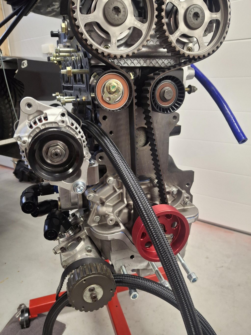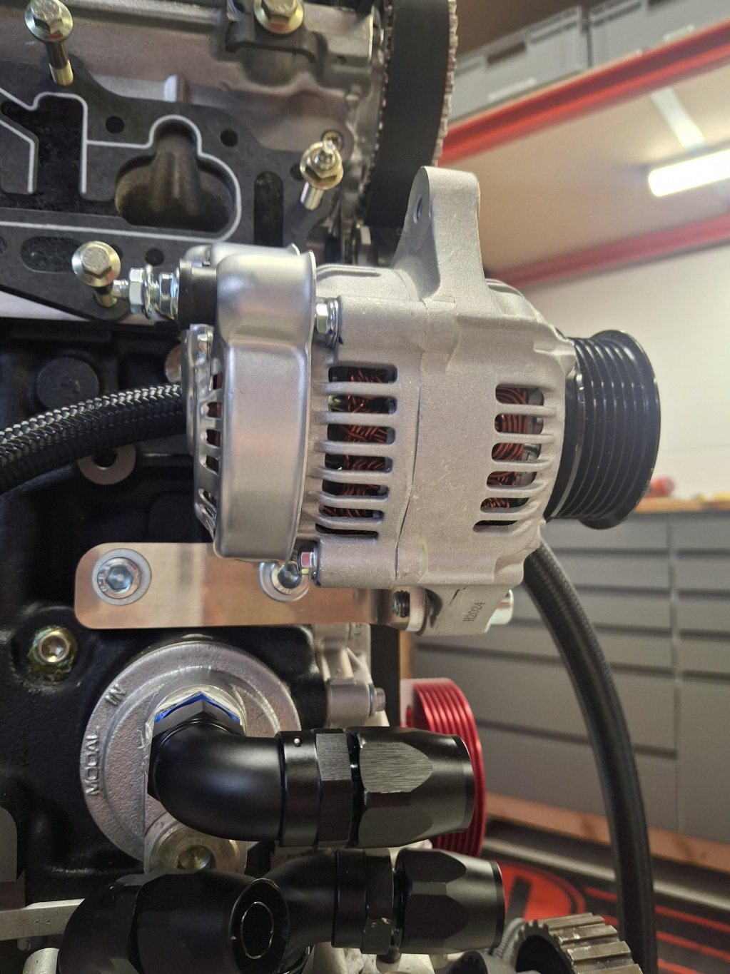 Ger 60A vid 6000rpm. Har även till denna beställt nedre/övre fäste från proforger, och helt plötsligt kommer denna bli enda förbrukaren på multiremmen, generatorn kommer agera spännare, blir 2 uniballs och "vantskruv". Generatorvarvtalen med remskivorna blev ca 1150rpm vid 700 samt 11800 vid 7500, tvivelaktig laddning på tomgång men annars blir varvtalet så högt vid fullvarv. Generatorn vägde 2800gr, säg 3kg med fästen. Sparade 1200gr på nedre remskivan och sparar ca 1kg på att gå till EWP80 pump, så det känns rätt okej, speciellt när man får både laddning, effektivare pump och världens alla möjligheter till styrning Oljetråget har fått nya slangar och pumpen schimsad bättre för remspänningen. Svarvade även av gamla vattenpumpsdrivningen från remskivan, denna behöver dock lite svets och färg. Apropå olja, blev överlycklig när det satt en "modine" vatten/oljekyl på blocket när jag packade upp motorn. Tyvärr fick inte denna plats vid filtret tillsammans med torrsumpen. Tanken är att ha den monterad vid oljefilteradaptern som kommer få byta plats, tillsammans med både oljetank och expkärl.