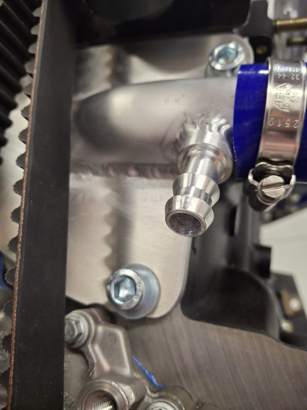 Hemmabyggda vattenintaget monterat och klart. 13mm slangnippeln är till oljekylen, så ett "delflöde" från pumpen kommer gå igenom oljekylaren och tillbaka in. Diskuterade detta med Davies craig och vi tyckte samma, ett 10mm hål tjuvar så lite flöde så det är ok att det inte går genom vattenkylaren.