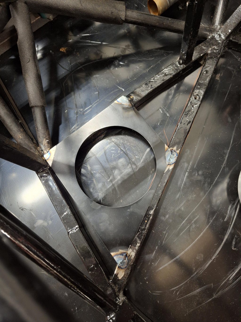 Pedalstället monterat, tidigare satt allt i en tunn plåt mellan ramrören, lite flexigt. Körde 2st (tunga) 25x3 vinkeljärn. Skall till ett 3e framför pedalerna som hälstöd, men hann inte så långt. Den uppmärksamme ser även att jag påbörjat att ta bort aluplåten ovan och lagt igen hål, skall bli kolfiber här strax. Hade kunnat flyttat cylindrarna och skurit bort mer plåt/vikt, men jag orkar inte iår