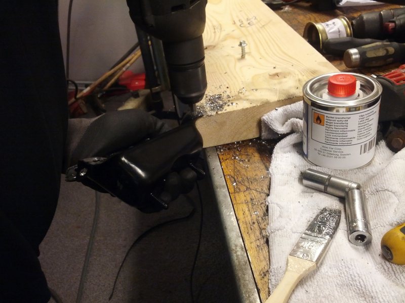 Lite senare under kvällen var det bestämt att jag och Jussi skulle ge oss på bilen med ett par småsaker, det var framförallt bältesöglor men jag tänkte samtidigt passa på att justera främre krängaren när vi ändå hade bilen i luften. Vi började dock med att jag for iväg och plockade upp ett MC däck då det skulle på hans hoj ikväll. Inte för att jag är sugen på hoj men när man kommer i närheten av en läcker hoj är det allt något som drar i mig, En dag blir man nog återfallsknutte men det tar vi då.. Väl ute i verkstaden så påbörjade vi öglejobbet direkt och det gick så smidigt så jag trodde knappt det var sant, efter att ha plockat ut fartfabrikens fiffiga underreda med stolen i så mätte vi lite snabbt och kollade undertill, det såg smärtfritt ut där vi behövde borra och lika fort var vi igång med grejorna. En kort stund senare satt allt på plats och vi kunde gå på nästa jobb. Kränghämmare skulle justeras, även här gick det väldigt smidigt då grejorna varit loss i dagarna, vi tryckte in stabilisatorstagen i det innersta hålet och NU var krängaren satt i hårdaste läget :-) Så länge tömde Jussi en burk zinkfärg över Fia plattorna och lite annat under bilen så plötsligt såg den nyare ut än en ny undertill ! När vi var klara med detta så gav vi oss på att montera bältet på passagerarsidan och det gick ganska bra, Jussi fick agera testdocka då hans kropp är som en människas och inte som min Mammutliknande. Lite justering av remmar och vips hade vi en hyffsad längd på allt. Efter att vi hade monterat tillbaka stolen insåg jag att en bälteshållare till originalbältet hade hamnat på sniskan och den enda lösningen var att lossa stolen igen, gör om gör rätt, dock tog det bara 10 minuter extra så var den saken biff. Jag passade även på att efterdra passagerastolens bultar in i sidofästena då dom släppt lite. Gaspedalen har varit ett sorgligt stycke historia och jag är inne på 3:e pedalen då dom spricker i nedre leden, igår tänkte jag göra en patentare men med hjälp av ETK konstaterade vi att det saknas en låsring och jag VET att detta löser problemet, imorrn blir detta löst och det skall bli så gött! Jag minns ringenresan 2010 när pedalen gick sönder, det var sådär skoj att bara gasa direkt mot armen. Med detta avklarat så är bilen i det skicket jag tänkt mig inför avfärden, eller nja den skall tvättas av både på utsidan och insidan om jag hinner (som det heter när man är lat) sen skall det in lite mer packning men annars så! När jag skriver detta är det typ 36 timmar till avfart så nu jäklar är man på G! Tack till alla er som gjort resan möjlig Tobbe på Need For Speed, Henrik, Jussi och Fartfabriken, jag har nog glömt att nämna en och annan men jag uppskattar er insats oavsett vilket! Hålen till öglorna färdigborrade!