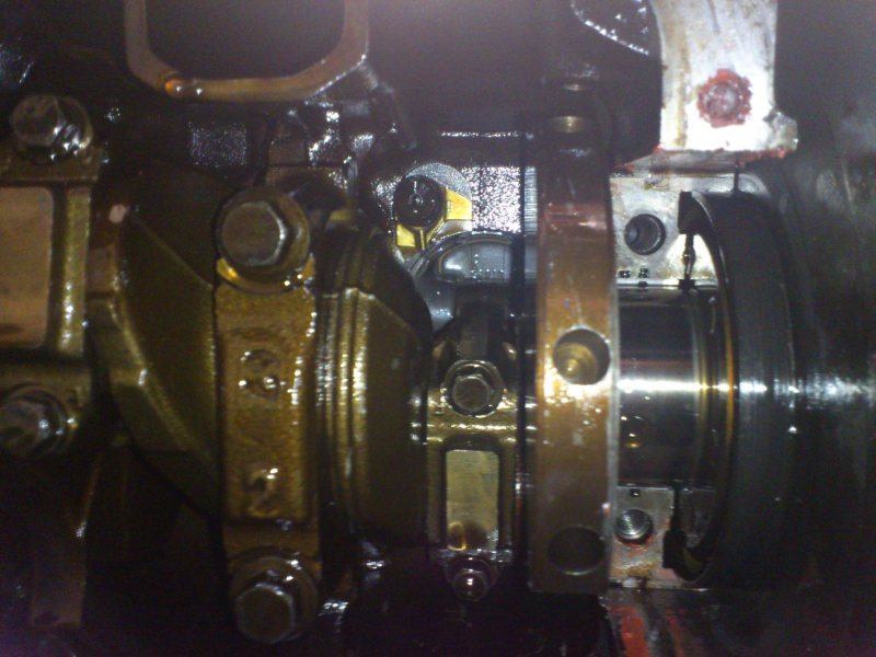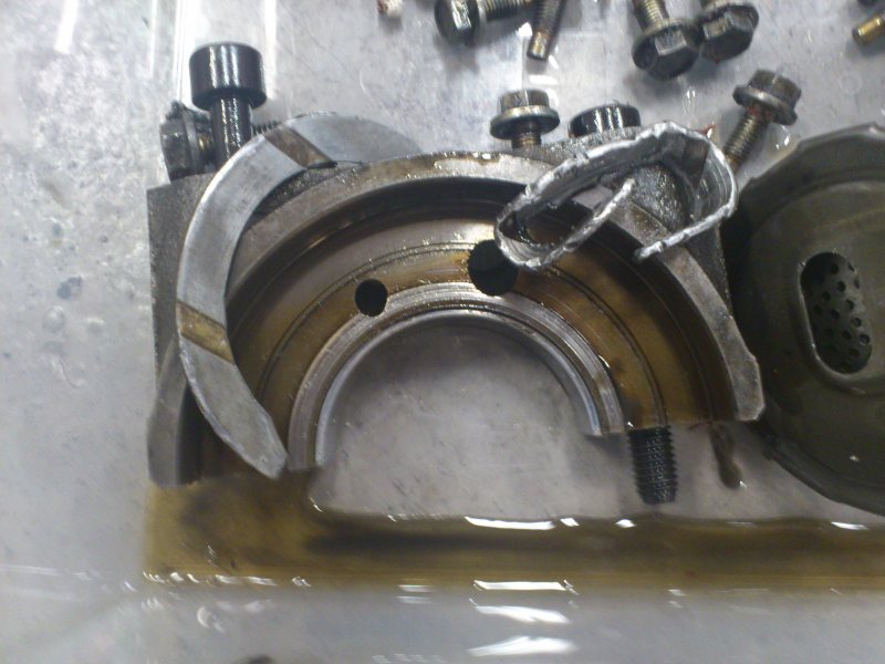 Skulle ta ner tråget för att montera oljetempmätaren då jag hittade de bägge axiallagrena i tråget, det ena har fått ordentligt med stryk. Troligen har det ena hamnat ovanpå skvalpplåten och sen fått lite smällar av veven.