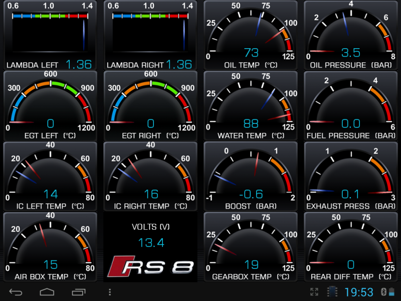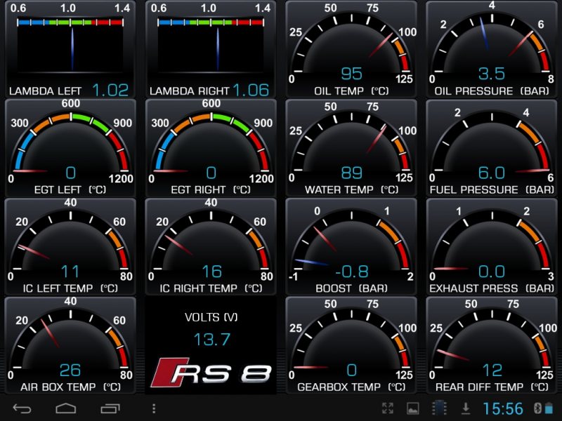 Tryckgivare som inte är inkopplad visar tyvärr inte 0 utan där flippar mätaren omkring.. så på bägge nedan så är inte bränsletryck inkopplad men på ena visar det 0 o på andra 6. Även lambda right är inte inkopplad för den sitter nu på Innovative mätaren men ändå så hoppar även detta värde omkring mellan lamda 1.00 till 1.36