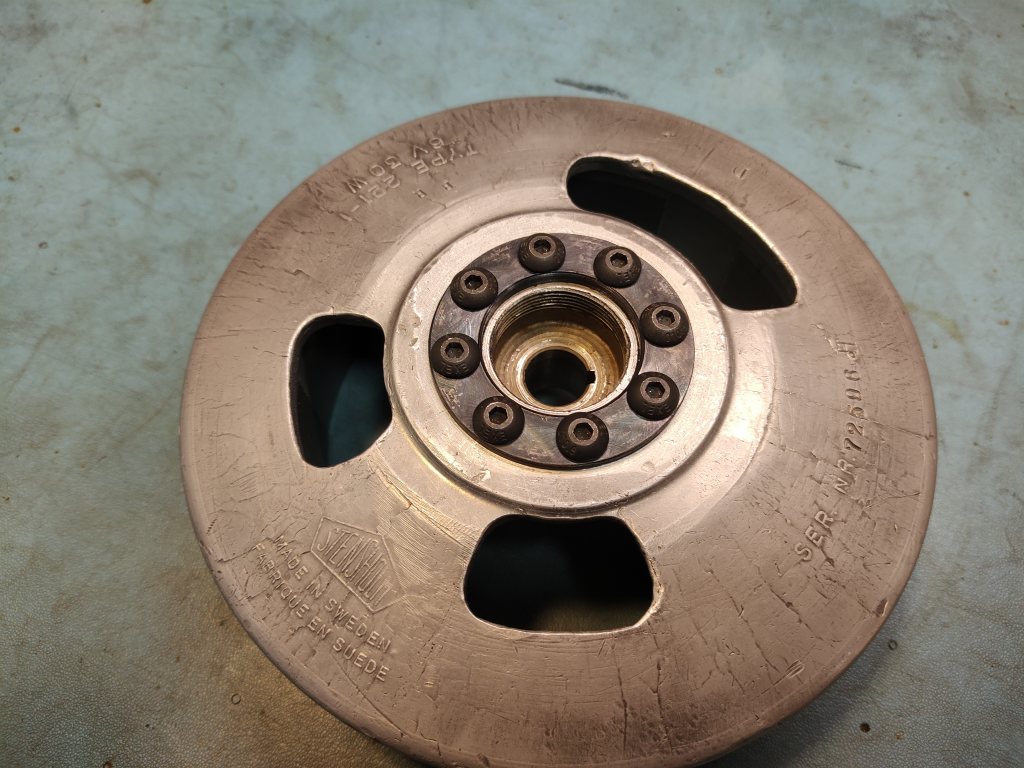 Blånerade ringen också för lite korrosionsskydd, bara för att jag kan. Skruvarna är obehandlade 10.9 med en rejäl droppe Loctite 270. Änden på skruven ska stukas till också tänkte jag. Läser man tabeller så ska de dras till 8,1 Nm, jag nöjde mig med 7 Nm. Det var gränsfall att insexbitset började runda skallarna där. Inget problem eftersom det inte ska demonteras under min livstid, men det ser ju lite illa ut. Gnista finns också, provkickade lite. Får kolla tändläget nån gång framöver