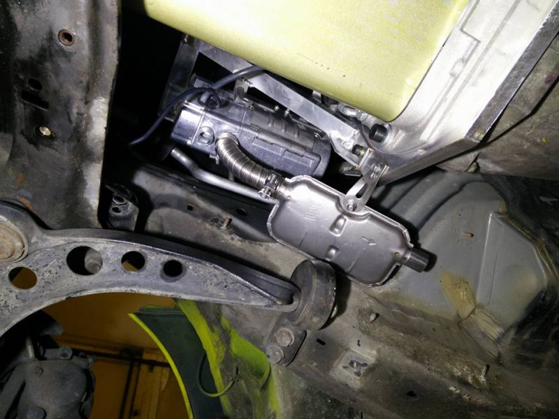 Jag använder original värmeelement osv för kupévärmen och tydligen håller brännarna väldigt dåligt om de bara får gå korta perrioder, så någon form av energibuffert var tvungen att byggas. Då det är dåligt med plats i bilen fick det bli en utrymmesanpassad alu-tank på 15liter där motorns ECU en gång satt. Såhär i efterhand blev den för stor, för det tar säkert 15-20minuter innan man får värme, men å andra sidan har man värme ganska länge utan att ha brännaren igång så...