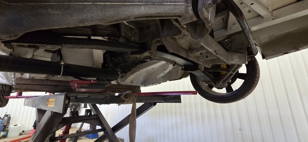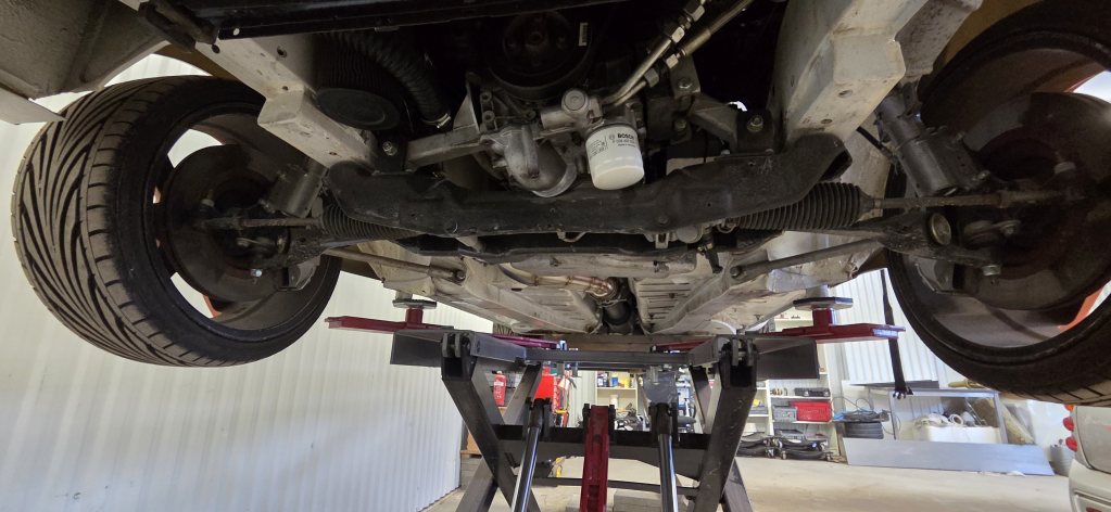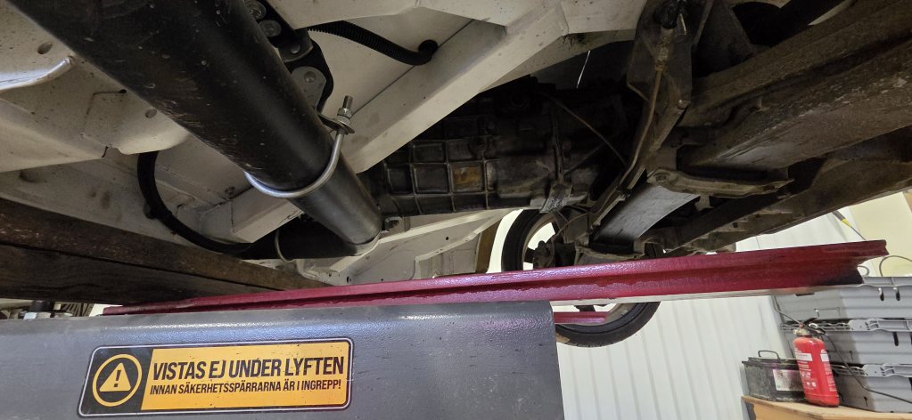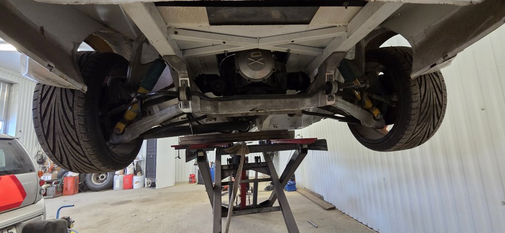 Att hitta en bil går dock trögt och jag tappade lite driv i väntan på det. Städade i garaget iaf och lyfte upp den för att grubbla lite över ev ändringar av bränsleledningar o tankplacering. Så här ser det ut under den iaf om någon är intresserad av lite halvdåliga bilder.