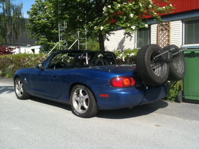 Perfekt! Jag har länge funderat på att bygga en däckhållare som fästs i hitchkroksfäste (Flyin' Miata och Hard Dog har dragkroksfästen) men det här är ju en färdig lösning som dessutom är billig. har du provat med fyra hjul? _________________