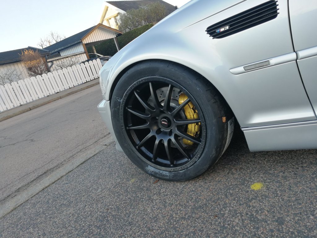 Nya däck och fälg, för prov montering. Vilka hjul vinklar kör ni med (hjul inställning) kör ni med? Fälgar: TEAM DYNAMICS MOTORSPOTR Däck: Pirelli Trofeo R 265 35 18 Hela 5 kilo lättare än original m3 -18" / fälg = totalt - 20kg lättare ofjädrad vikt