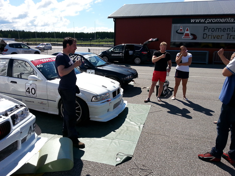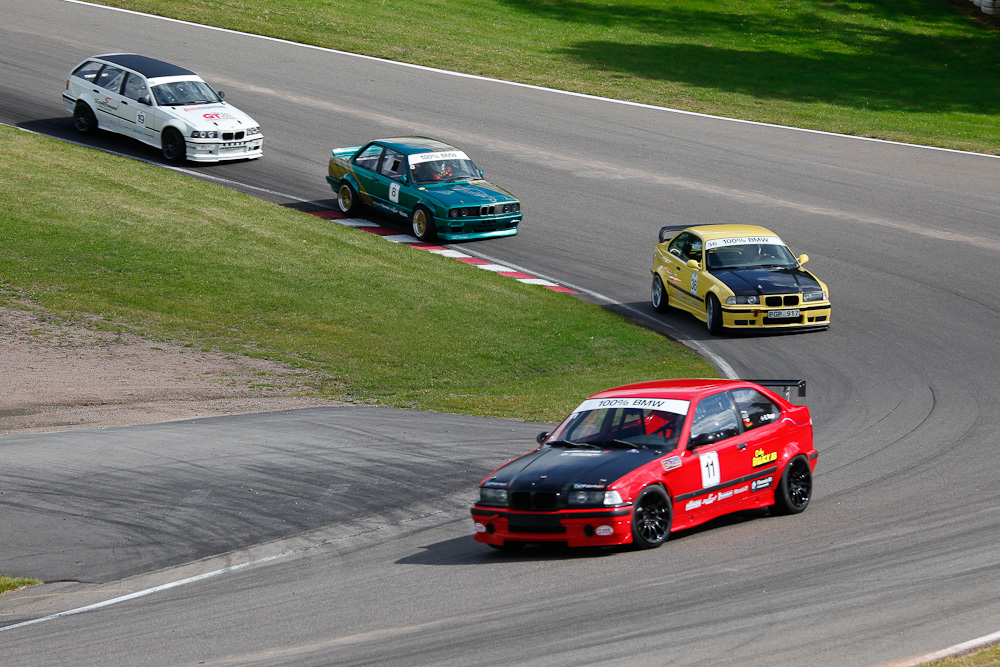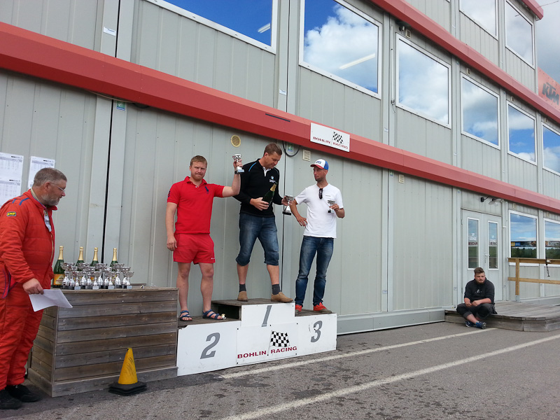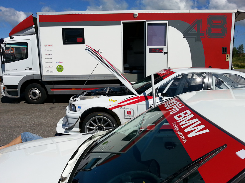Hittar inte riktigt tempot och blir lite ensam en kort stund innan Ahlin kommer bakifrån i en rasande fart. Jag får försöka plocka upp takten men rätt som det är har han slagläge på rakan. Jag har inte lust att ens försöka med några ojysta manövrar och stänga, utan håller mitt spår och Rickard bromsar förbi på innern. Känner att det inte gör så mycket. Tänker att jag nog kan ta mig förbi. Ligger många varv tätt tätt bakom och det blir riktigt kul racing! Får tillbaks glädjen och känner att vi har lite samma ambition om någorlunda juste racing och att komma hem med hela bilar. Våra bilar går grymt jämnt på rakan och Rikard är rutinerad så några luckor eller misstag dyker inte direkt upp. Rätt som det är ligger Sanden också han tätt bakom, men han lyckas passera oss på rakan med fördelen av sin mer effektstarka m3 3,0. Summa summarum slutar jag på en sjätteplats andra racet. Ett kul race, även om förhoppningen om att ta en något högre placering fanns. Glad och trött var det bara att pack in sig och bita ihop de femtio milen hem. Nästa tävling, och troligen även nästa körning, blir inte förrän 29e augusti på Knutstorp. Det ser vi redan fram emot! Favobanan