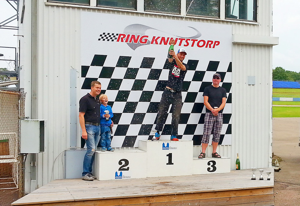 Race-Ahiln & Semester-Sanden Lördag morgon bjöd på alldeles perfekt raceväder; sol och 15 grader! Modifierat fick träna ihop med special och standardklassen körde sin tidsträning själva. Kände genast att jag gillade banan. Roliga och svepande kurvor i kombination med lite nivåskillnader och några mer tekniska kurvor. Banan var rätt ojämn på ett relativt skönt och stötigt vis. Det skulle dock visa sig ge vissa problem. Hårda slag i apex gör att mina relativt stora och tunga bromsklossar slår tillbaka kolvarna i oken med lång slaglängd på bromspedalen som följd. Inte optimalt. Fick därav dutta med vänsterfoten på bromsen på flera av rakorna för att få stum pedal vid bromspunkterna. Är det värt att testa sk. anti knock back springs?? Känns som det passar bättre på bilar med mer effekt?? Kval två hamnar jag bakom Erik #58 i specialklassen och jag jagar honom allt vad jag kan hela träningspasset. Vi har ett skitkul pass ihop och jag tror det triggade oss båda till att pressa hårt. Döm av min förvåning när det efter kvalen visar sig att jag tagit pole position med 1:15,19 i modifierat! Race #1 Startar i pole på höger sida med fyra specialbilar framför och en till vänster. Bakom ligger Sanden och snett bakom till vänster Patrik Skoog. Starten går och det går rätt ok. Specialen till vänster drar ifrån och lämnar en lucka som skoog försöker utnyttja. Det blir trångt nere i första kurvan och i stridens hetta glider jag och skoog in mot varandra med en liten lätt smekning mellan hans framhjul och min dörrlist som följd. Detta följs av ett hett varv där den vita kombin är sannerligen stor i backspegeln. Jag leder men vet att det blir mycket svårt att hålla denna placering hela loppet. Jag har Erik #58 i specialklassen framför och känner att jag inte riktigt kan ta ut svängarna helt i de kurviga partierna för att iaf försöka skapa en lite lucka bakåt. Utgången på rakan blir inte helt toppen tyvärr och Skoog lockar över mig till vänster sida av banan, bara för att mot slutet kasta sig höger och bromsa förbi på innern. Man lever och lär Då ändras sinnesstämningen helt och jag börjar jaga istället för att vara jagad. Jagar efter Skoog allt vad det går och det går rätt bra. Känns som han får jobba rejält och vid något tillfälle glider jag nästan upp vid sidan på rakan, men inser att det inte går. Försöker även glida upp på yttern vid Ejes krön.. Ett klassiskt misstag på Gelleråsen Bromsar men det går inte och får kast och sladd rakt ut i gruset med femton retursladdar som följd. Gustavsson som hela tiden legat bakom tar min andraplats och får ta över rollen att jaga Skoog. Innan alla femtielva retursladdar är över ser jag Sanden och Eriksson närma sig och jag lyckas precis sladda upp framför dom i god rallycross-stil Precis innan dom hinner passera mig. Tredjeplatsen måste jag hålla tänker jag! Andreas är uppe och stressar rejält bakifrån med sin 130 vid ett par tillfällen, men jag kan oftast ta ut en lucka i de kurviga partierna där jag trivs bäst Och tredjeplatsen tar jag. Jag håller på att göra bort mig och glömma att man måste passera målflaggan INNAN man släpper gasen Galet kul, spännande och fysiskt jobbigt race! Är helt vimmelkantig när jag kravlar ut mellan rör och bågar i parc ferme och det är nästan så jag ser hägringar.