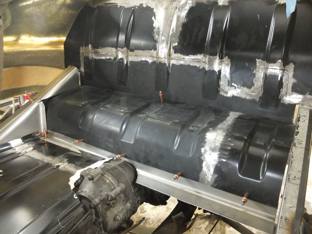 golvet över växellådan är ju inte speciellt bärande... Bockade mha ett 30mm rör som jag la i min 1 meters kantbock (gammal gjutjärns LUNA ) och med det fick runda bockar som ser mer tilltalande ut.. även ett 2.5 tum stålrör användes för några radier.. satte ihop plåtarna med "clekkos" vilket är tillfälliga nitar.. mycket smidigt..