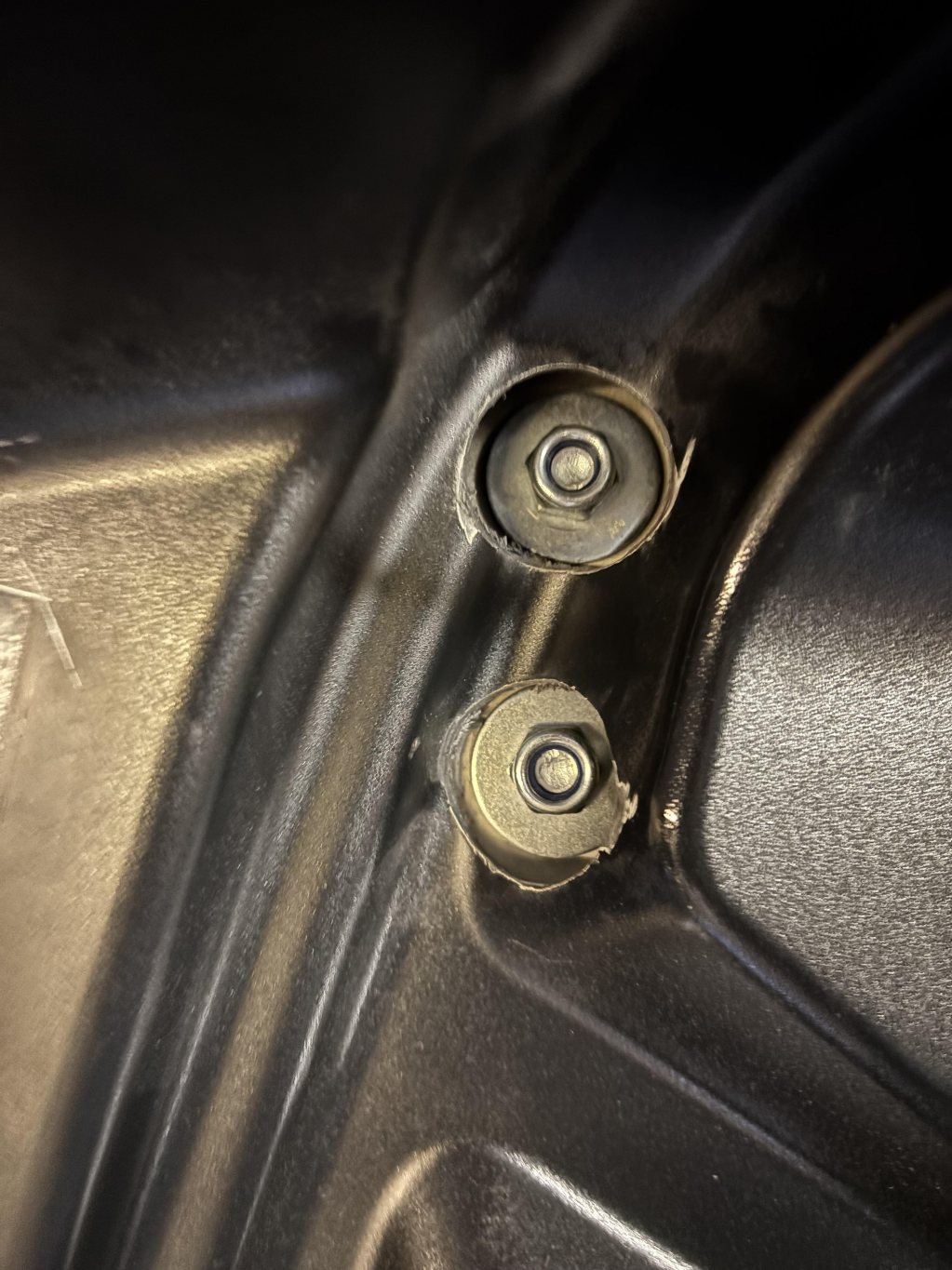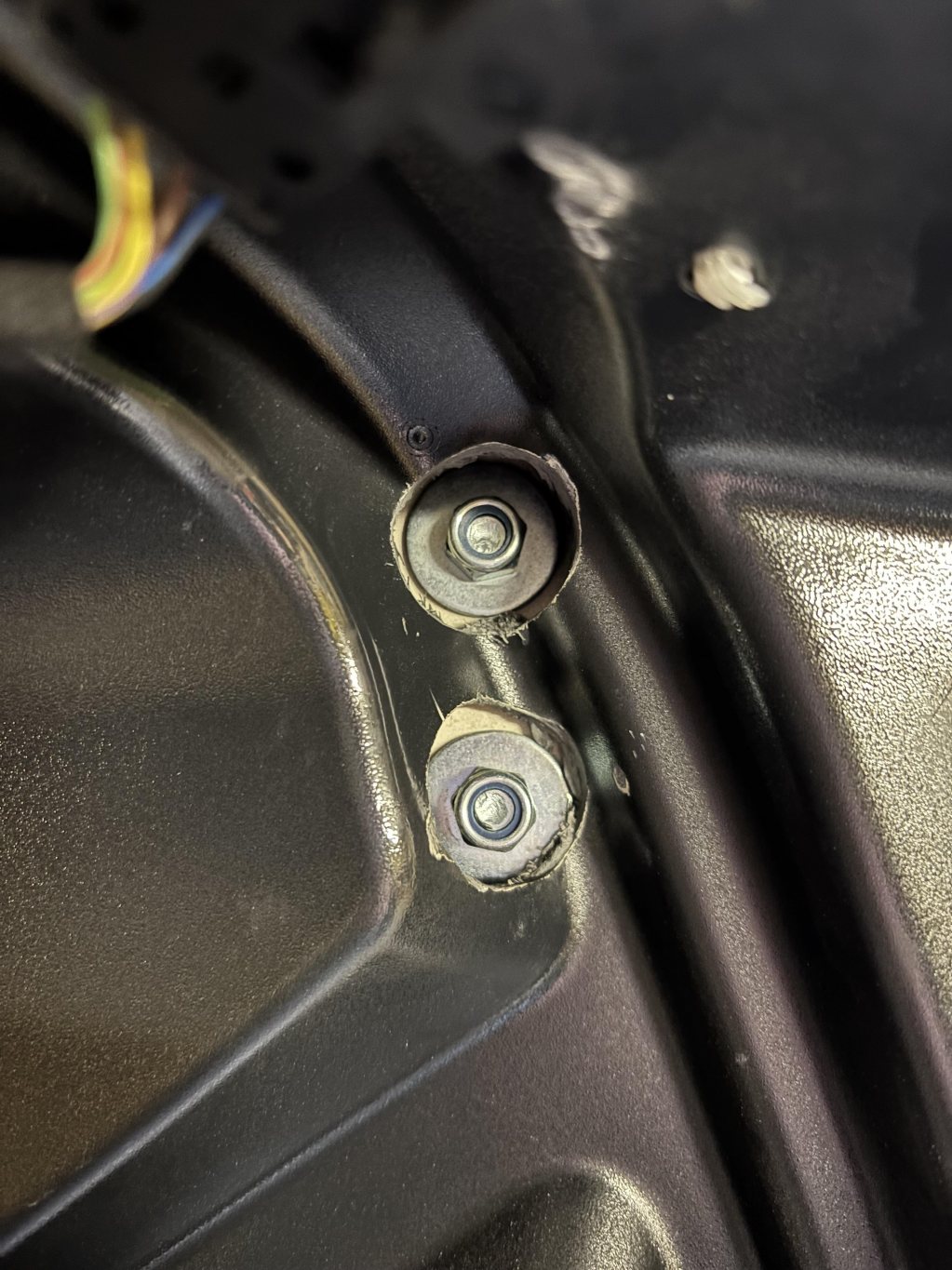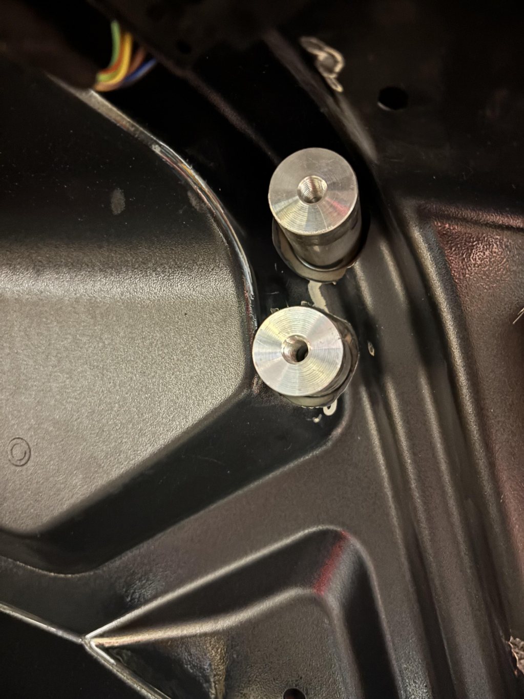 Endast borrat hål och skruvat med brickor i yttersta lagret i luckan tillverkat av nått glasfiber/kolfibermaterial.