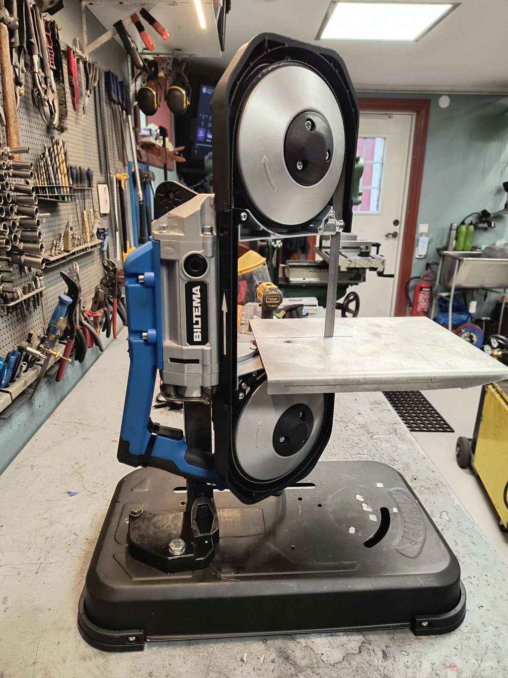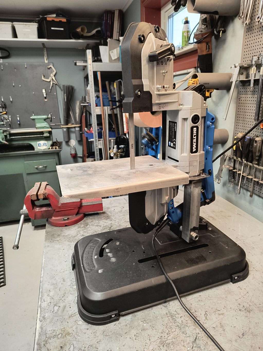 Såg det här inlägget och åkte direkt till biltema och köpte en bandsåg utan att ha en aning om att bandsågen ovan utgått och ersatts av en annan. Första problemet var att sågen inte gick att tilta upp 90 grader, så jag gjorde en förhöjning, inga konstigheter. Sen upptäckte jag det stora problemet. Sågjäkeln går åt fel håll! Det slutade med aningen större modifikationer. 😄 Vände sågen upp och ner och tillverkade ett fäste som använder fyra av skruvarna som håller ihop sågen. Skruvstycket var av tveksam modell så det åkte bort. Sen återstod bara ett bord som tillverkades av en aluminiumplåt. Det är absolut görbart med den här modellen, men räkna med lite mer jobb.