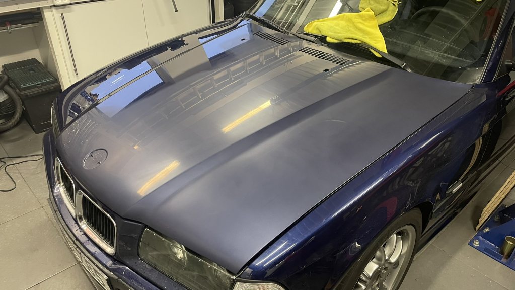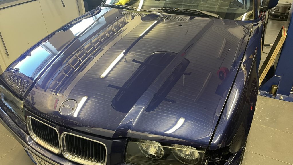 Vinterns planer för bilen är inte speciellt stora. Bakvagnen ska rivas ner och snyggas till samt få nya bussningar. Styrservoslangen med integrerad kylslinga läcker och ska bytas. Den är beställd sedan i somras men är restnoterad. Utöver dessa småsaker väntar oljeservice. På lyften hänger Aston utan styrväxel i väntan på svar hur jag ska ta mig vidare. Bakvagnen på E36an kan alltså inte påbörjas förrän Aston står på egna hjul igen. Hade inte varit dumt med dubbelt så stort garage och en lyft till... Svaret på ursprungsfrågan kommer här; jag har länge stört mig på motorhuvens risiga lackjobb. Hela bilen är omlackad och i hyggligt skick men huven är inte vacker. Massor av prickar och dammkorn. Har varit sugen på att våtslipa och se hur bra man kan få den. I och med att jag ska lackera det nyinförskaffade M-paketet i vinter kan jag skicka med huven också om jag skulle förstöra lacken medan jag lär mig. Sagt och gjort, 1500, 2000 och 3000-papper till slipmaskinen klickades hem och jag började slipa på bagageluckan. På bakluckan har jag hål som ska svetsas igen och därför lackeras efteråt, dvs bra att börja träna på den för att få en känsla för hur mycket avverkning man har vid respektive kornstorlek. Snart kände jag mig redo att ge mig på motorhuven. Fukta, slipa och torka av med mikrofiberduk. Efter några sekunder torkade det helt och då såg man om man hade blanka prickar kvar, dvs apelsinskal, eller andra skador. Så fortsatte jag slipa i korta intervaller för att inte bränna genom, till hela huven var helt matt. Därefter började stenskott fylldas med färg och klarlack. När det torkat "hyvlades" överflödet bort och man kunde börja slipa stenskottet helt jämnt igen. Så där höll man på, allt fler av alla dessa små, små defekter i fronten eliminerades. När man går på med finare papper ser man direkt om underliggande skador/repor försvinner eller om man behöver fortsätta med det grövre pappret. Tidsödande men roligt att "laga" och göra fint. När jag tillslut gått genom alla stegen polerades glansen upp igen. Jäklar vad bra det blev! Det tog visserligen i princip en hel helg men tillfredställelsen var enorm!