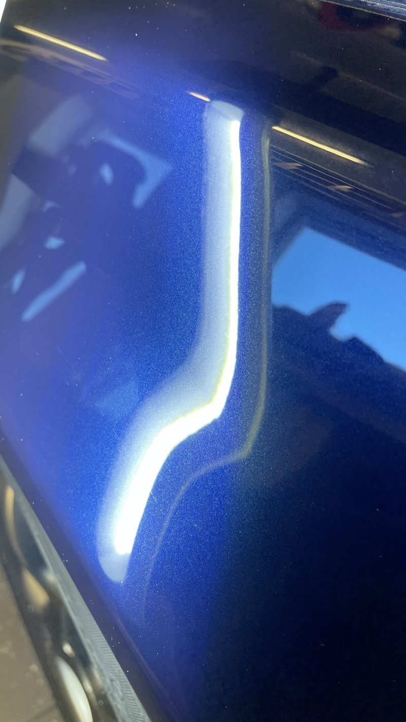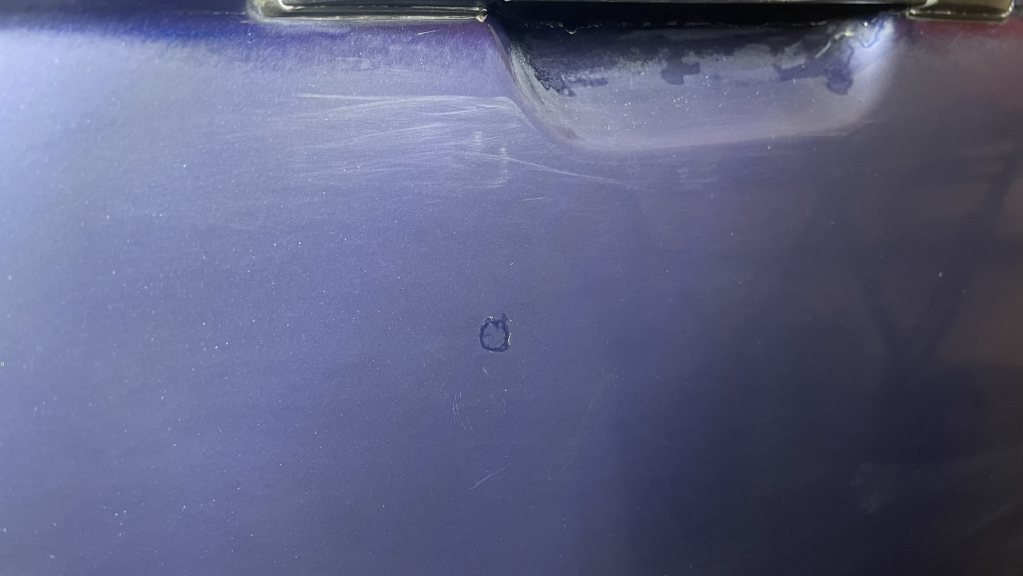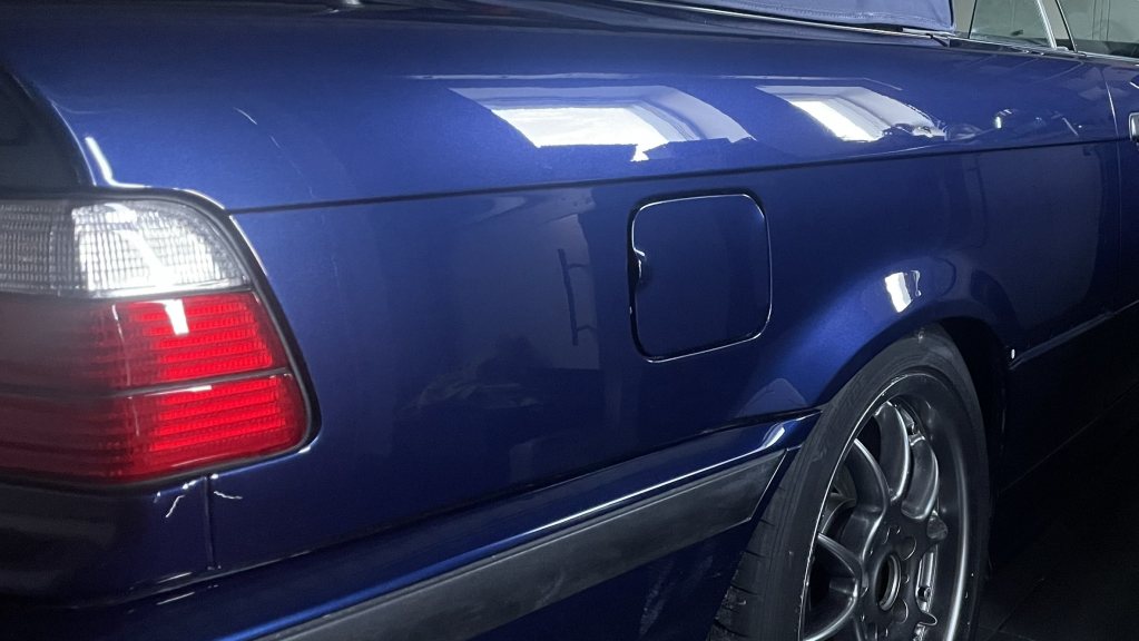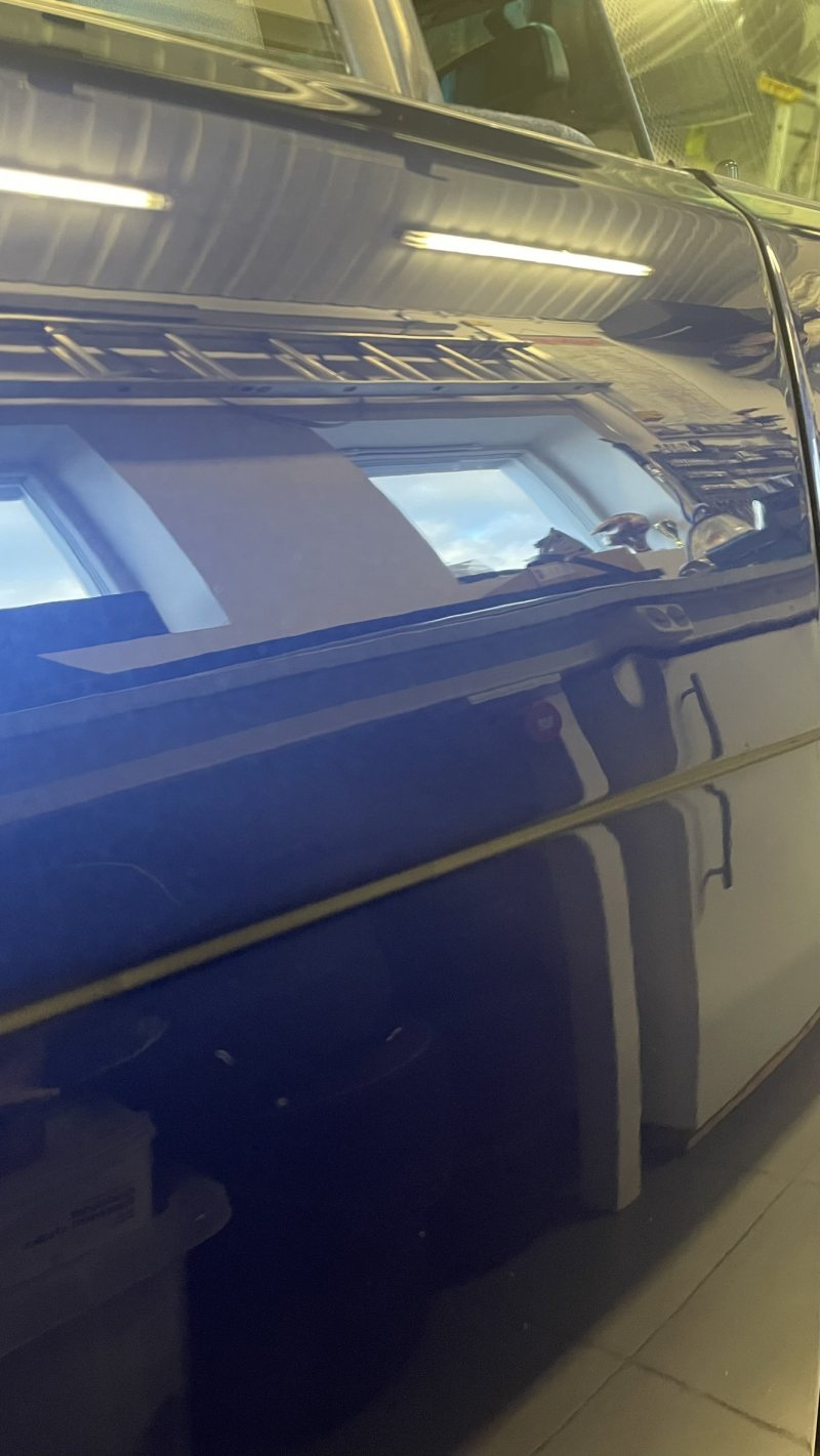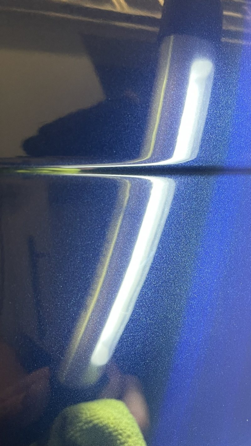 Klarlackssläpp mitt på förardörren. Fyllde skadan med klarlack i många steg för att i slutändan få det helt fyllt. I och med att jag då slipade mellan gångerna tror jag att klarlacken börjar bli tunn. Det började bli antydan till ljusare partier runt skadan, då avbröt jag för att inte riskera gå genom helt. Skadan är till 95% fixad, får duga så. Helgen gick och även ett par vardagskvällar spenderades i garaget. Tredje helgen hade jag hunnit slipa hela varvet runt samt tagit ytterligare några småskador på huven och bilen polerats. Först heavy cut, sedan ett bättringsvarv med heavy cut igen innan ett varv med polish, finish och slutligen keramisk försegling. Bilen blev löjligt fin! Ingen apelsinskalslack någonstans, inga stenskott utan bara ett grymt djup i lacken och gnistrande metallic. Har en repa på vänster bakskärm som jag inte fick bort. Tror faktiskt den sitter i färgen, under klarlacken, för oavsett hur mycket jag slipade kom jag aldrig åt den. Jag gick genom lacken på två olika ställen på bilen, inte så farligt men ska se om jag kan åtgärda. Det klart värsta stället är på höger backspegelkåpa men den får åka med in i lackboxen.