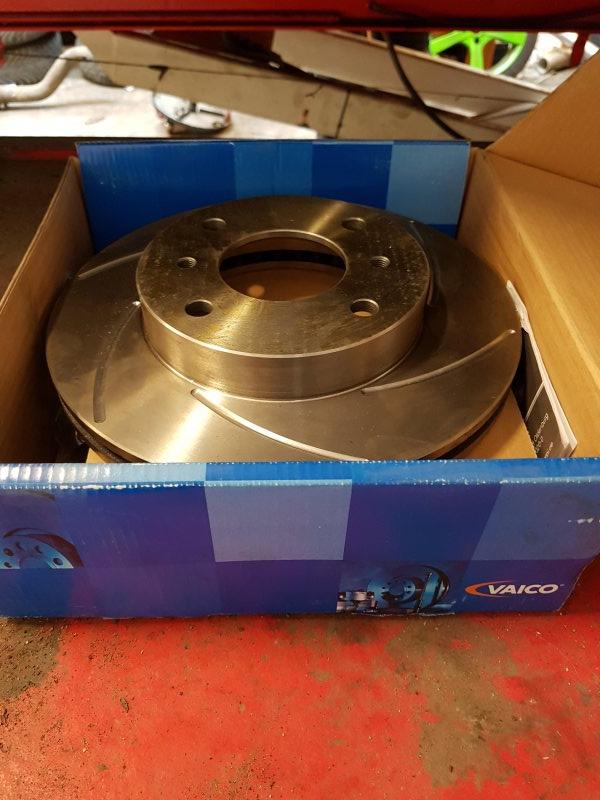 Vi testar ju nu Porterfield ST43, specialtillverkade belägg från Frozen Rotors i USA. Ferodo DS11.1 som vi kört med tidigare har fungerat bra men har börjat släppa bitar efter ett tag. Dessa har gått 4 timmar och ser kanonfina ut. Vi bytte också skivorna, de som satt på bilen gick hela förra säsongen och första rejset denna säsong. Egentligen tror jag vi gott kunnat köra några rejs till, de har en del ytliga sprickor men inget allvarligt. Å anda sidan, vi hade färdiga skivor liggande - slitsade lokalt, Vaico, alltså billiga saker.