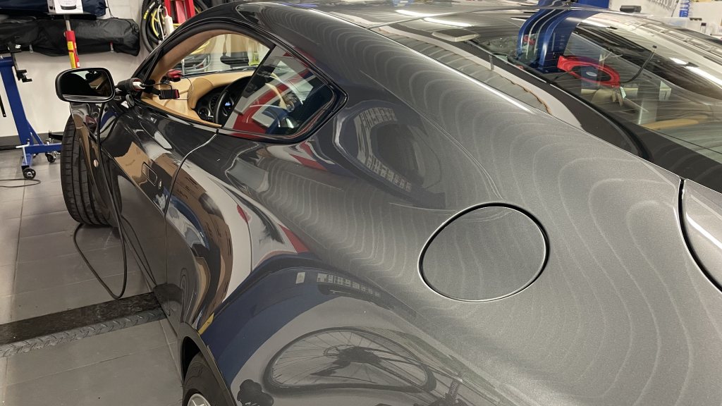 En blå GT4 speglar sig i bakskärm och baklampa.