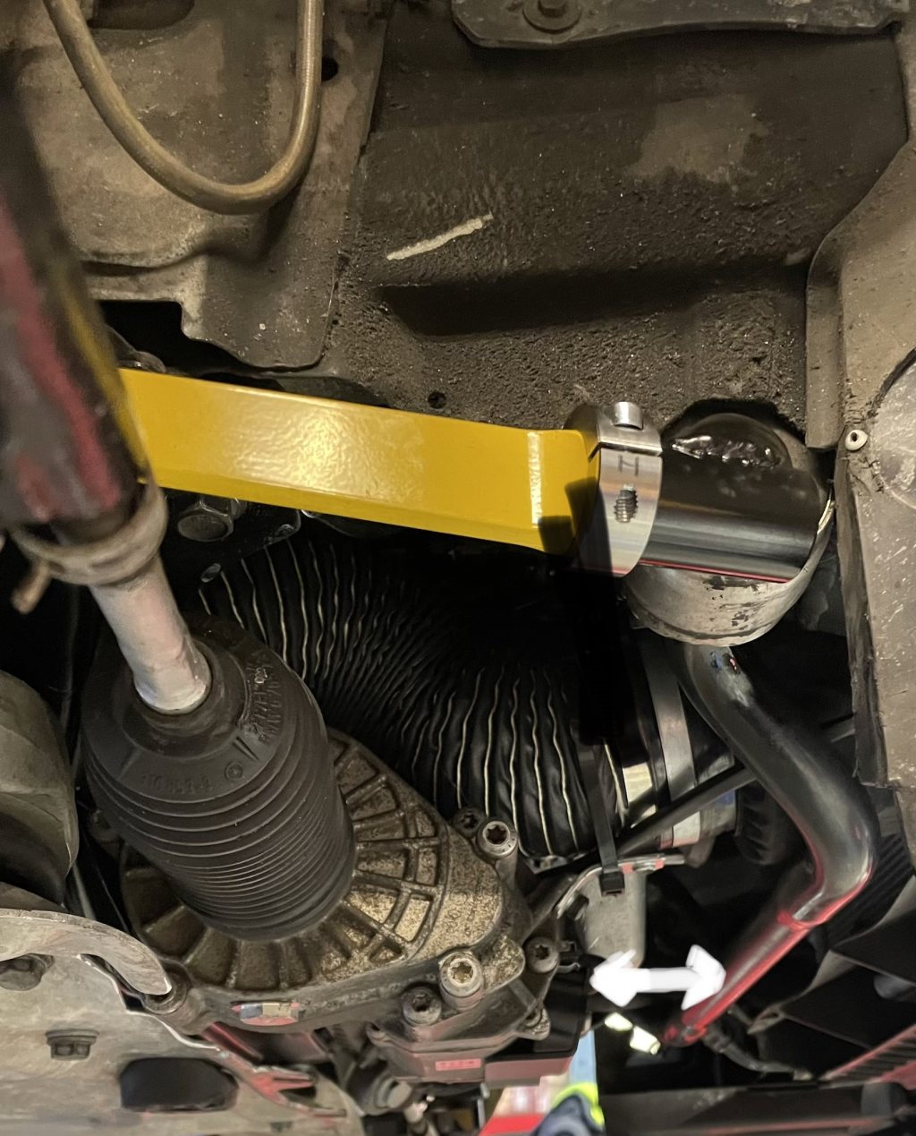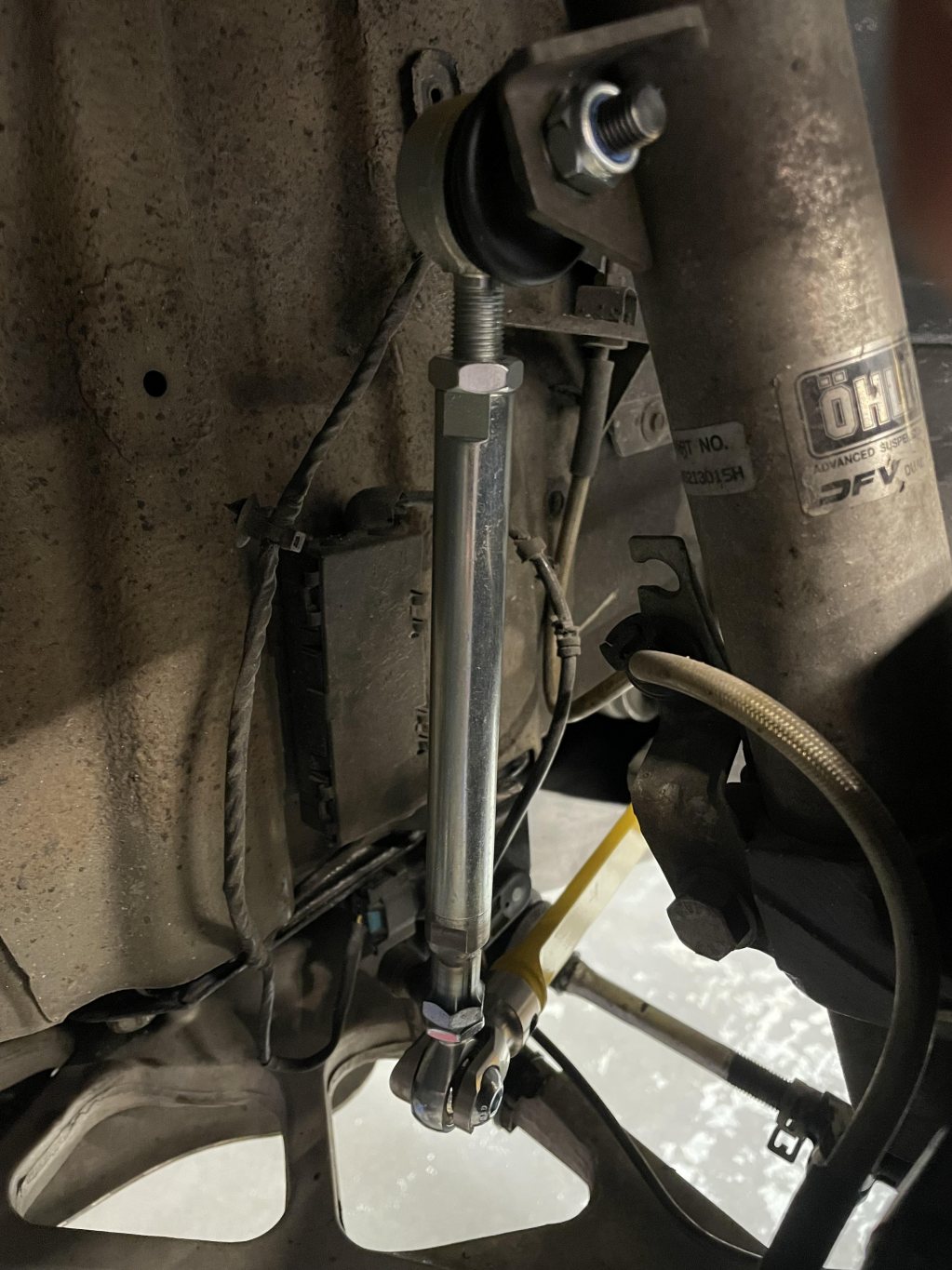 När jag bytte styrväxel så blev det trångt för krängaren. När hjulen var utfärdade så var det bara några mm frigång mellan krängare/styrväxelns motor. Byggde om så att det blir mellanrum så att hjulen kan fjädra in. Bilden visar mellanrum utfjädrad efter ombyggnad.