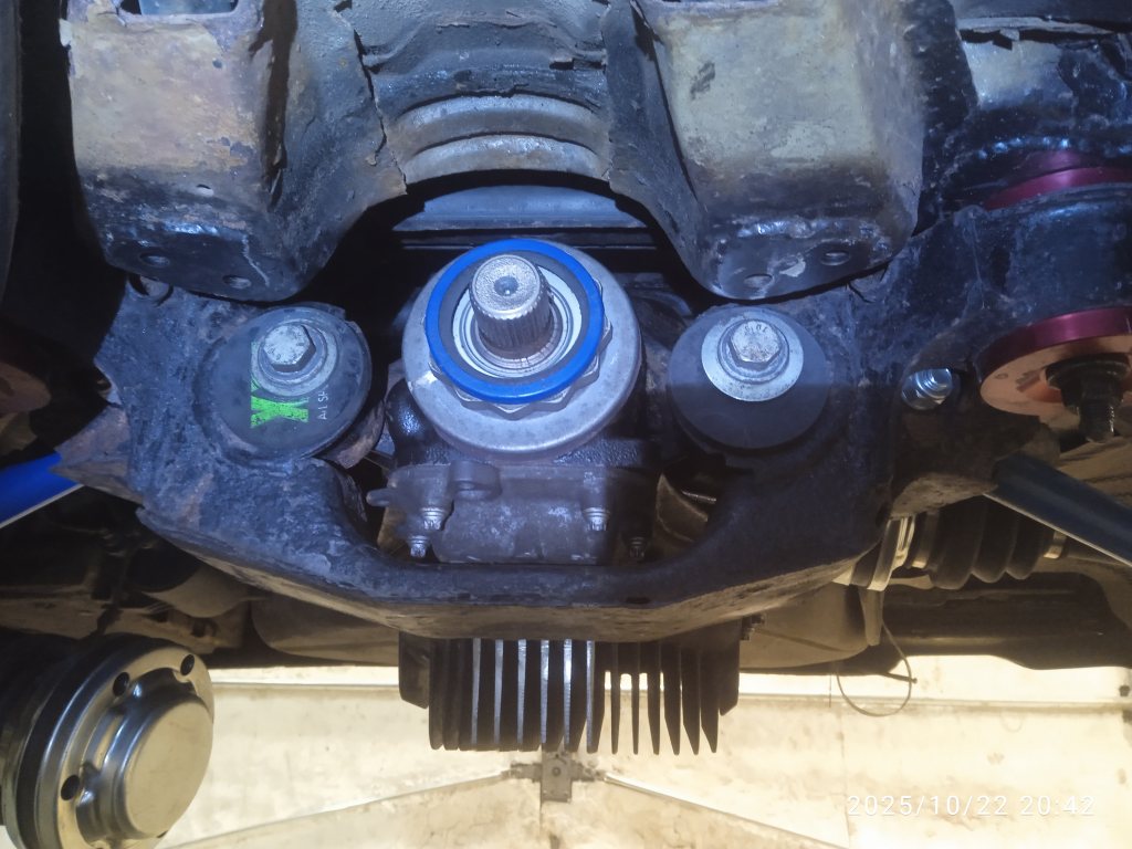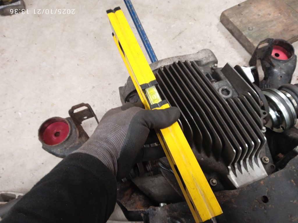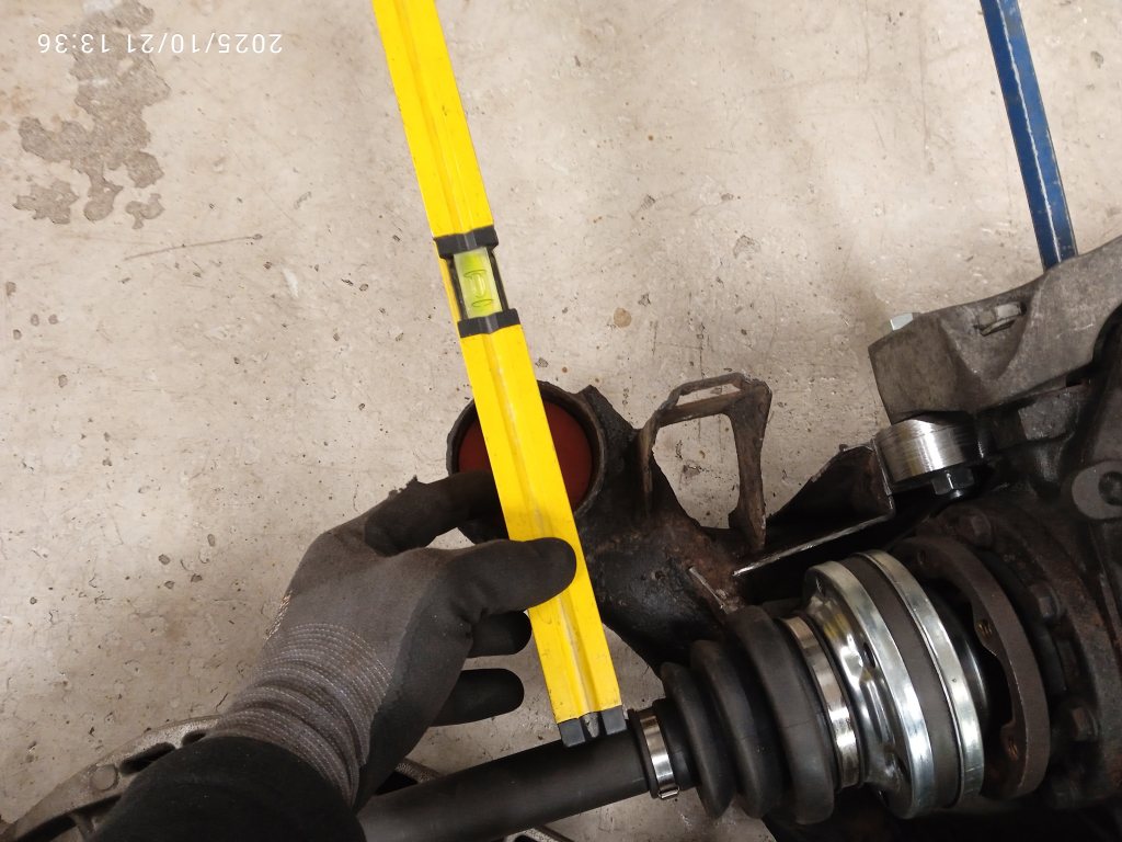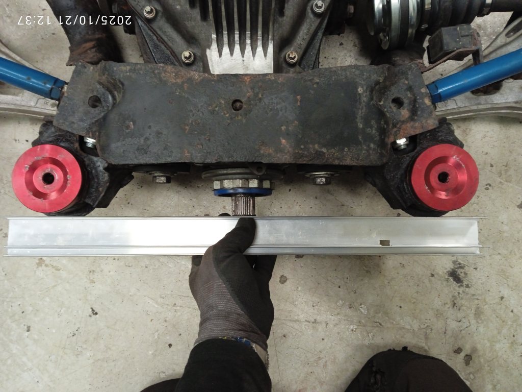 Jag mätte in linjeringen av diffen genom vattenpass. "burens" bussningar mot golvet på bilen är parallella med kardanen. Så jag ställde först in buren i våg.