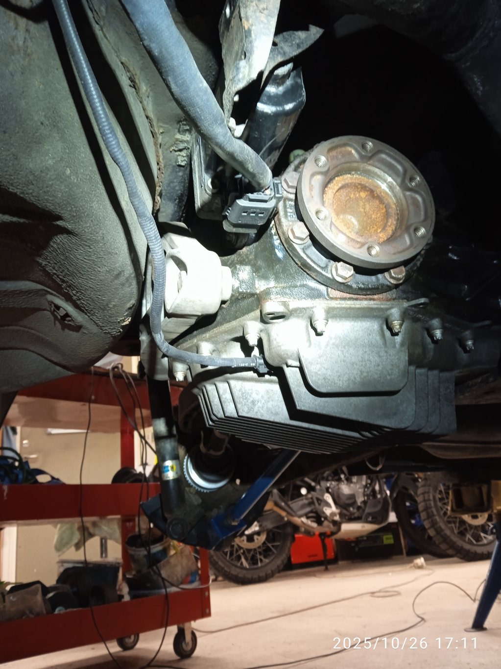 Nu sitter diffen på plats på bilen. Den väger 45 kilo, så någon form av lyft rekommderas. (orginaldiff väger 33kg) Satte dit buren först, sedan diffen. Ville försäkra mig om att den gick plocka loss separat. Fick banka lite på reservhjulsbaljan. Samt borra ett hål för kunna få in den skruven till mitt nya fäste. elmotorn tog också i lite grann. Det räcker banka lite på reservhjulsbaljan även här.