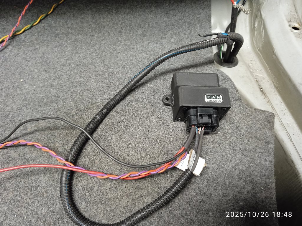 Placerade den i bagagerummet, lämpligt nära ett färdigt hål ner till diffen och sedan behövs bara en CAN sladd framåt. Jag borrade ett hål för kunna ansluta en USB sladd till cancheck för att kunna konfa den utan öppna hela lådan.