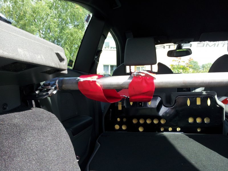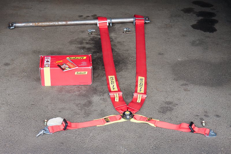 En harness-bar som kan monteras/plockas bort på 10 minuter utan åverkan på Ford Focus 2004-2010, fästes i baksätets öglor. Man fäller baksätet och lyfter stången på plats mellan ryggsätets fästen, trär i bulten och skruvar på muttern - klart. Det borde kunna passa i många andra också, men vilka vet jag inte. Avstånd mellan fästbultarna är 114,5cm. 800 + 1200:-, Paketpris 1500:- vid hämtning. Den är svetsad av Trendab med OMP bur-delar (40mm dörrsträva och anslutning till bur enligt FIAs krav). Den är omålad och har lite ytrost (se bild. Fyrpunktsbälte Sabelt 3"/2" FIA långt med krokar till nedre fästena. Bältet är 3 tums över axlarna och 2 tum i midjan. Tillverkat 2012 och FIA-godkänt till 2017. Sabelt modell 904118E. Bältet har använts med originalstol på ST och utan att ta bort originalbältet: Ena stolsbulten byts mot ögla som håller ena bältet, andra bältet träs på bältesstaget nedanför dörren. Bältet är i gott skick, med visst färgskav på låset (se bild). Använt en säsong utan krockar. (Extra krokar som egentligen är för smala medföljer, liksom bultar och öglor.) Stötta 800:- Bältet 1200:-. Säljer helst alltihop, paketpris 1500:- om du hämtar det (Stockholm Bromma)