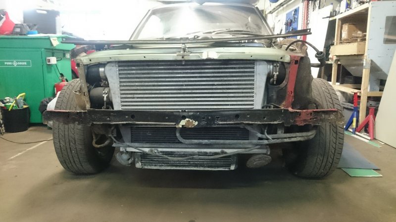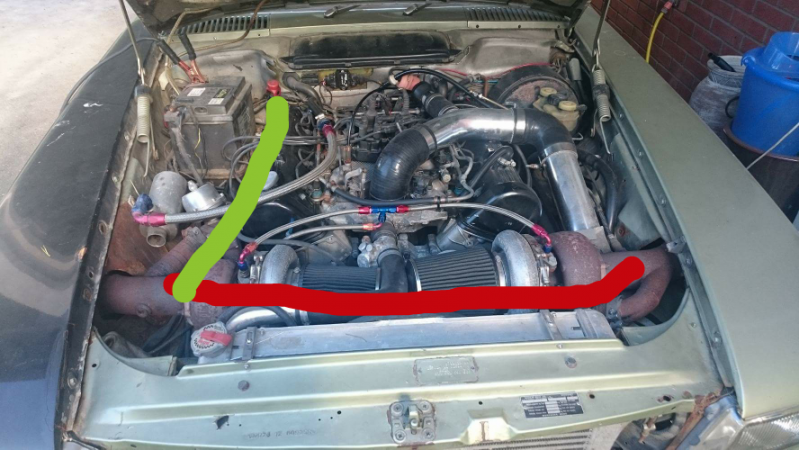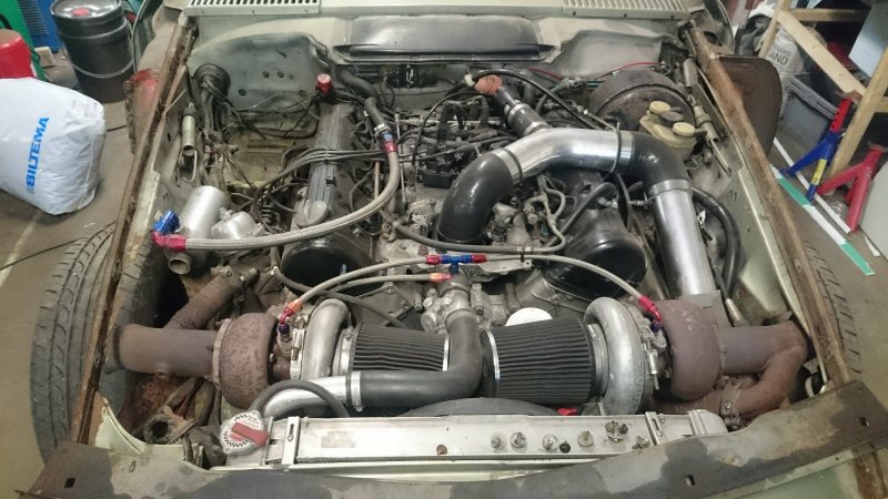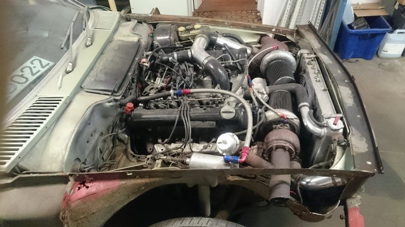 Jag skulle kapat bort batterihyllan och flyttat batteriet till baksätet till att börja med. Det skulle frigöra mer plats för downpipen från passagerarsidans turbo. Sen skulle jag försökt dra ner downpipen från förarsidans turbo och dragit ihop den med den andra sidan någonstans vid växellådan (alternativt under tråget, a'la Porsche 944 Turbo). Om det inte går kan du dra ner bägge DP vid var sin sida av motorn, kona ner till 2½ efter en halmeter och kör något som liknar originalsystem för resten. Effektmässigt tror jag inte att det är något större problem...det du förlorar kan du vinna tillbaka genom att flytta filtren till turbosarna (det ser ut att vara "varmluftsinsug" just nu )