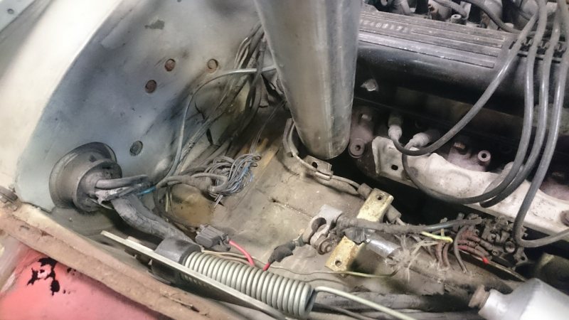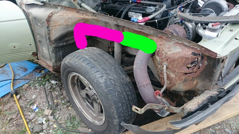 Största oron är frigången från däcket till avgaset, sen blir det nog ha luftutsläpp i skärmen för värmen. Detta är tanken i teorin som jag hoppas bli bra i praktiken. Där innerskärm möter brandväggen ska material kapas ut för att ge plats åt avgaset. Grön: 3" Rosa: 2,5"