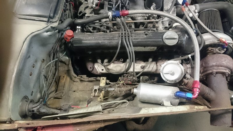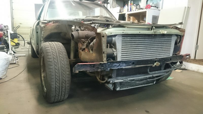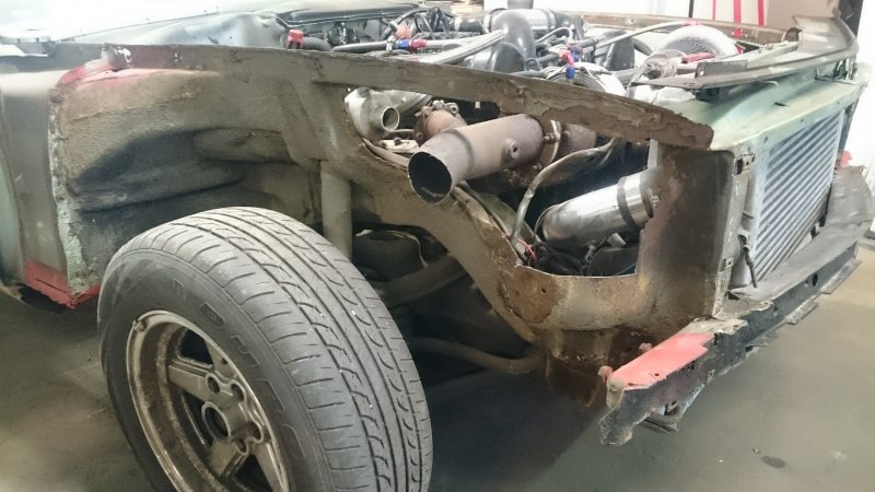 Ok. Att få ner en vettig downpipe brukar kräva en del kapning i karossen. Själv har jag V8 och 4"-pipa i en e36. Det gick åt många kapskivor..