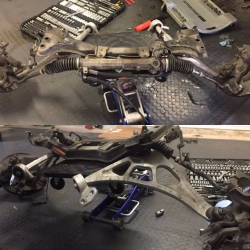 håller på med exakt detta just nu, men vi lossande hjulnaven och styrväxel och tog sedan ner framvagnbalk med länkarmar på. |