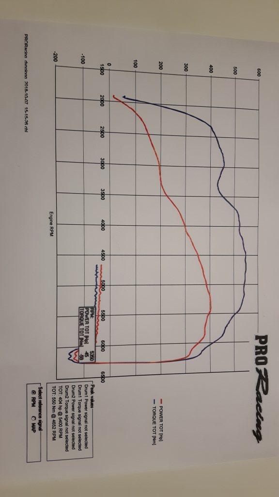 404 hjulhästar med automatlåda. 45hk i utrullning => 450hk + automatlådeförlust. 1.3bar på max effektvarvtal, kompressor kan växlas för 1.7bar. Dippen mellan 3000-3500rpm pga "lätt gasfot" för att undvika kick-down.