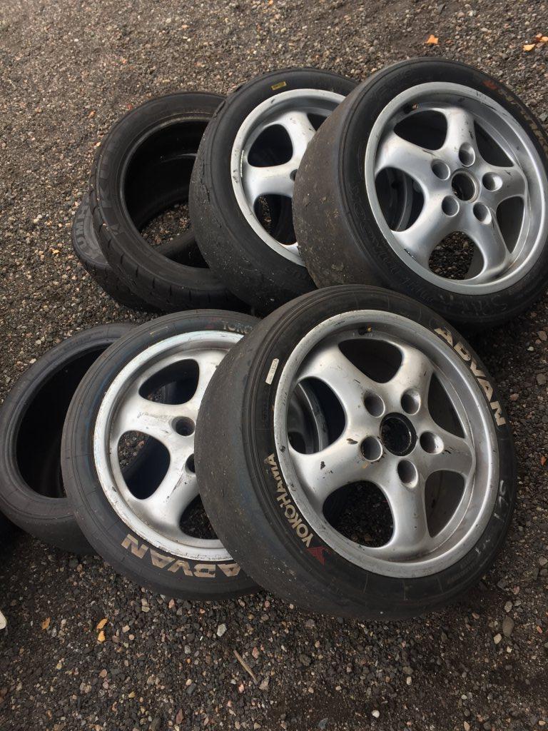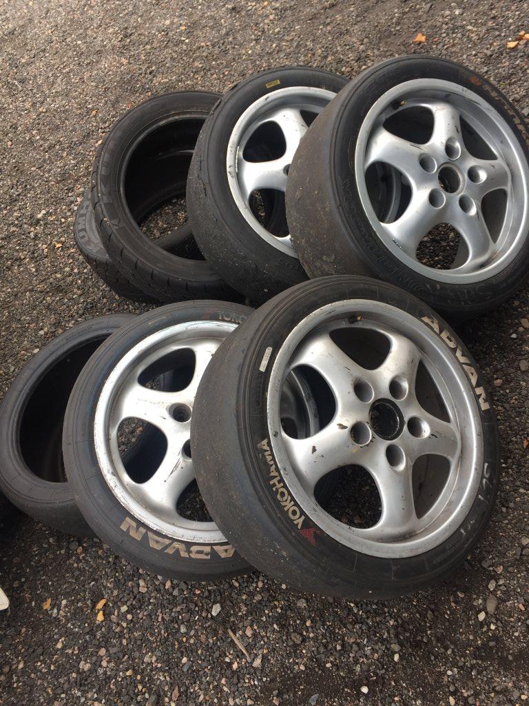 Garage rensning. 2 st fälgar 17 tum 9/et70, 2 fälgar 17 tum 9/et55. 5 st slicks 235/620. 2st Kumo mjuka R däck 225/45. 3,500kr för alla fälgar o däck. Däcken är helt ok att träna på, Tel 0708450496