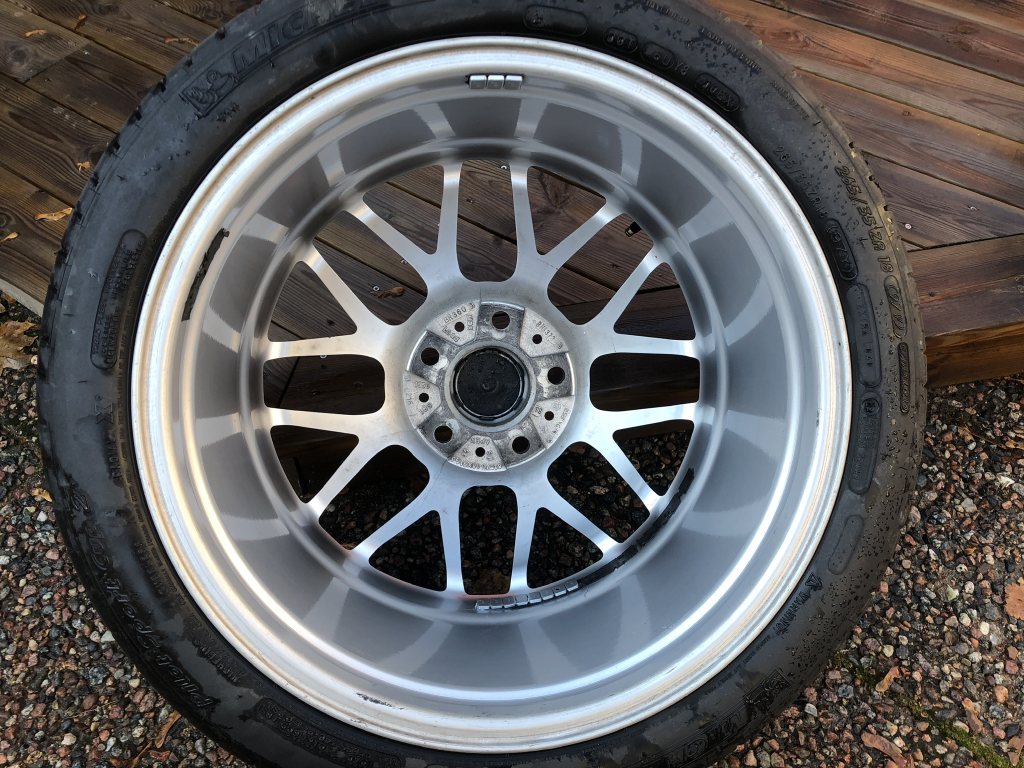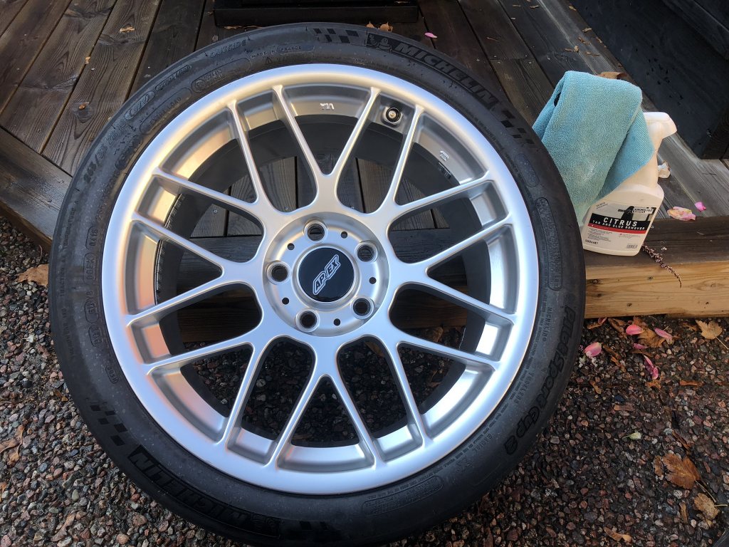 Hej! Kör en intressekoll på mina fälgar då jag funderar på att byta till 10". Fälgarna är Apex Arc-8 i dimension 9.5x18" et35. Bultcirkel 5x120. Färgen är hypersilver. Inköpta direkt från Apex i USA 2016. Skulle säga att dom är i mycket fint skick. Gått på bana så några små märken eller stenskott finns men generellt mycket fina. Insidan på en fälg har märken efter att mitt bromsok tagit emot en gång då det lossat och gått emot. Inget som påverkar funktionen, endast estetiskt på insidan. Regelbundet och ordentligt skyddade med polering och lackskydd. Sitter som en fläskläpp på M3 e46 men passar flera Bmw modeller också. Kan säljas lösa utan däck eller med Cup2 265-35-18 monterade. Två däck knappt använda från 2018 och två lite mer slitna från 2016. Pris utan däck: 13000kr Pris med däck: 16000kr Finns i Västerås men kan tas med till Sthlm med omnejd. Pm eller 0702830729