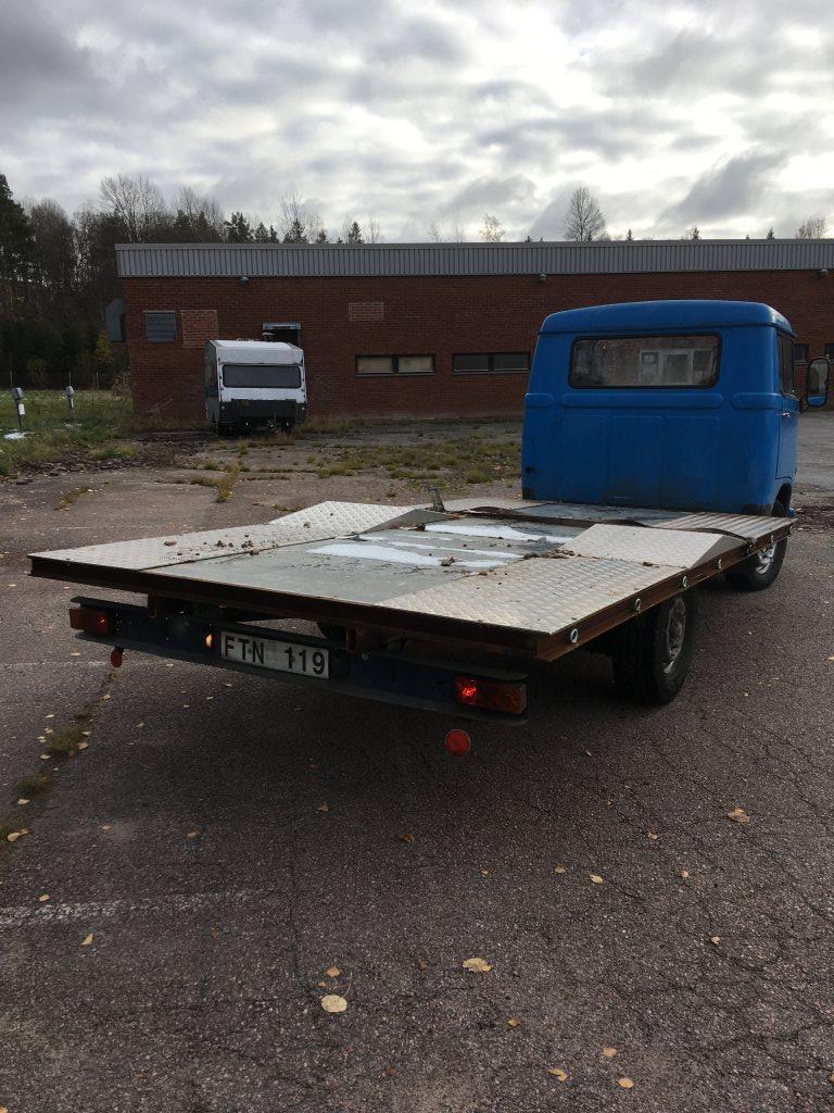 En extremt vacker 306 med många år kvar. Rost finns endast på hytten men ingen katastrof. Komplett bakvagn, motor å framvagn extra ingår. Nya c-däck M/S Förstärkt fjädring med volvl FL 7 gummifjäder Original träflak med ram. Man byter enkelt mellan flaken 8bult endast. Jag kör den var vecka utan problem. men skall man besiktiga den måste man lufta och justera bromsarna samt fixa halvljus relät. finns extra relä, reglage och mätare osv . Lastar 1800 på B-kort. Pris 18900:- för allt.