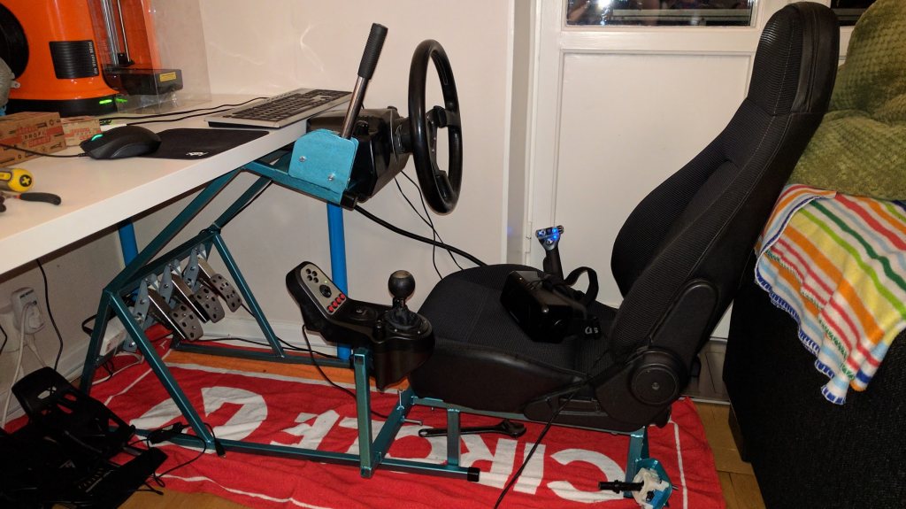 1. Hembyggd simracingrigg Logitech G27, stol ifrån en miata och adapterplatta för momo/sparco ratt. G27 ratten ingår (ej den på bilden) Stolen och redalerna sitter ej ihop så lätt att justera längd osv. Ursäkta sunkig bild, den står i förrådet nu