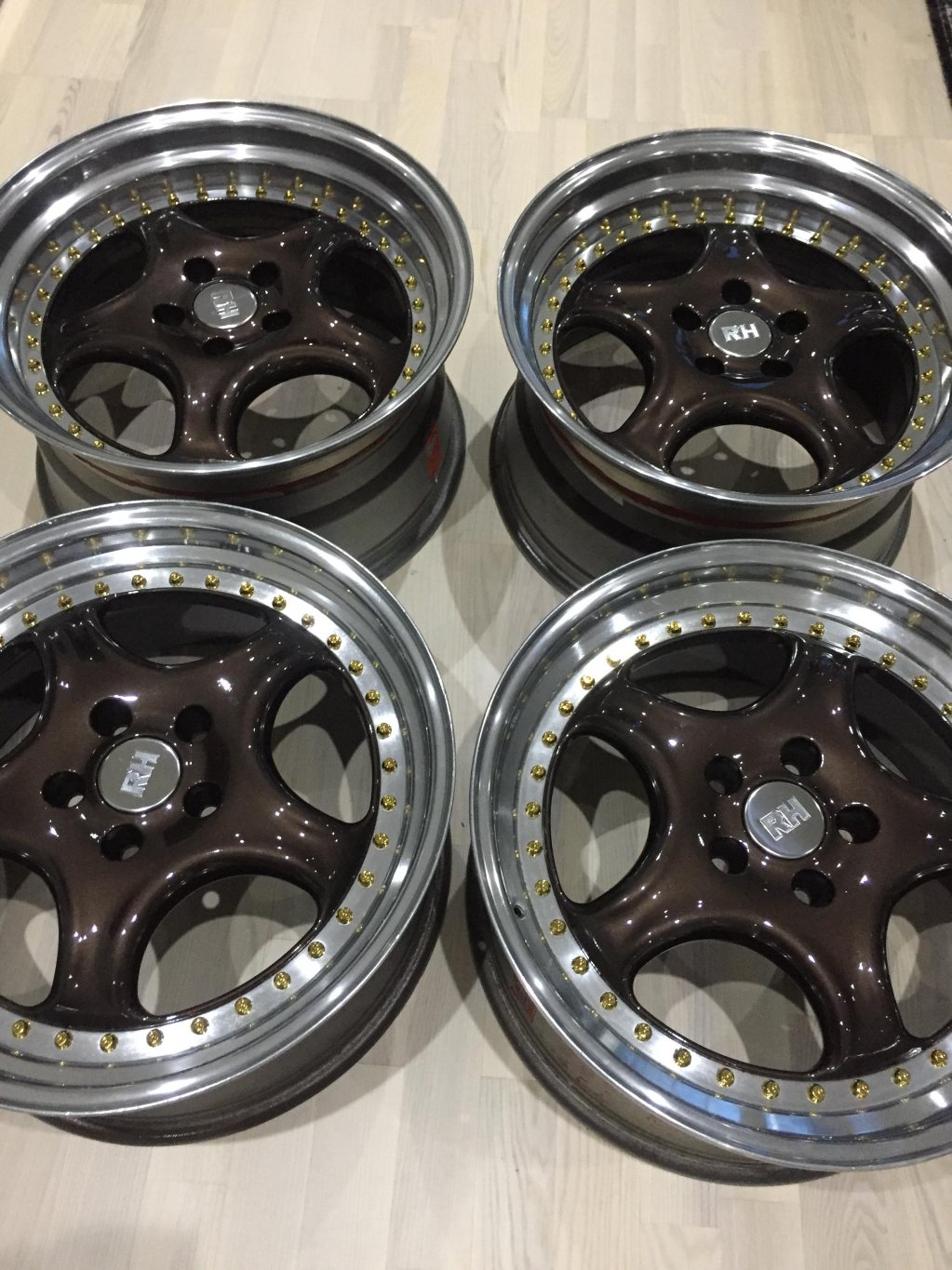 En uppsättning splitfälgar utav modellen RH ZW4 i 18". Banor polerade förra sommaren, ser fortfarande fina ut. Något ytligt kantskrap finns på någon fälg, men inget större. Framfälgar: 18x8,5 ET59 Bakfälgar: 18x9,5 ET47 Bultdelning: 5/112 5x112 Följer med fyra ytterkanter i renoveringsbehov så man kan bygga om till 18x8 och 18x9. -Nya RH centrumkåpor. -Nylackade centrum i Volvos bruna. -Nya splitbultar i guld. Pris: 15000kr