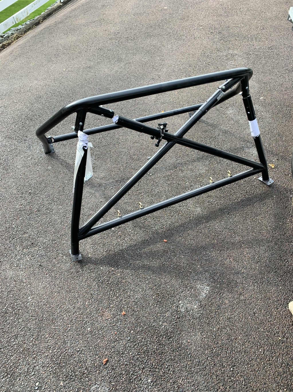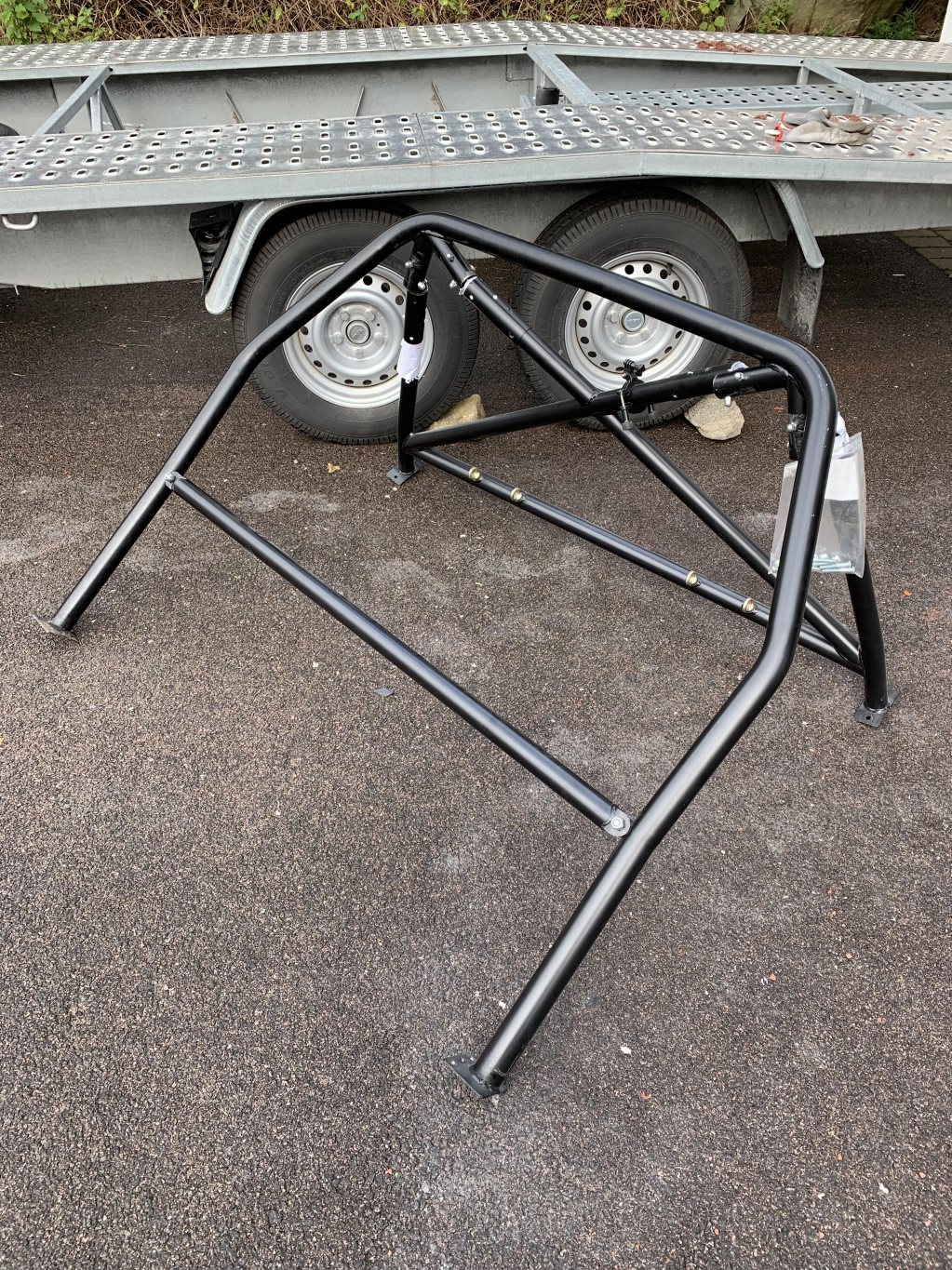 En mkt fin halvbur ifrån Wiechers. Buren är i CrMo och lackad i mattsvart. Några få repor och märken vid montering utav hylsorna (pappret på bilderna är instucket för att skydda lacken). Alla skruv som behövs finns med. Suttit i en bil utan taklucka, men avståndet till innertak var ok, så BORDE passa bil med taklucka. Goprofästet ingår ej. De sista två bilderna visar den "åverkan" som behövs göras på karossen. Nypris med tillvalen ca 10 000 Pris: 5 000 SEK PMa eller ring o7o1-812737