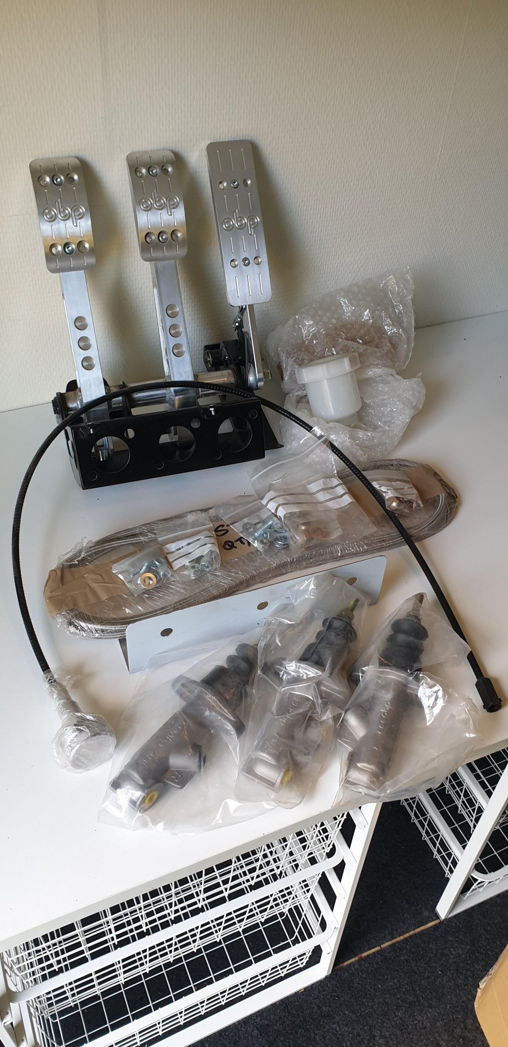 OBP Golvmonterat pedalställ v2 med bromsvåg och 3st cylindrar 3st vätskebehållare samt monteringsplåt och div monterings detaljer. Cylinder strl 0.625, 0.7 samt 0.75 Aldrig använt. Hämtas helst i Uttervik eller Nyköping. Pris:4000kr