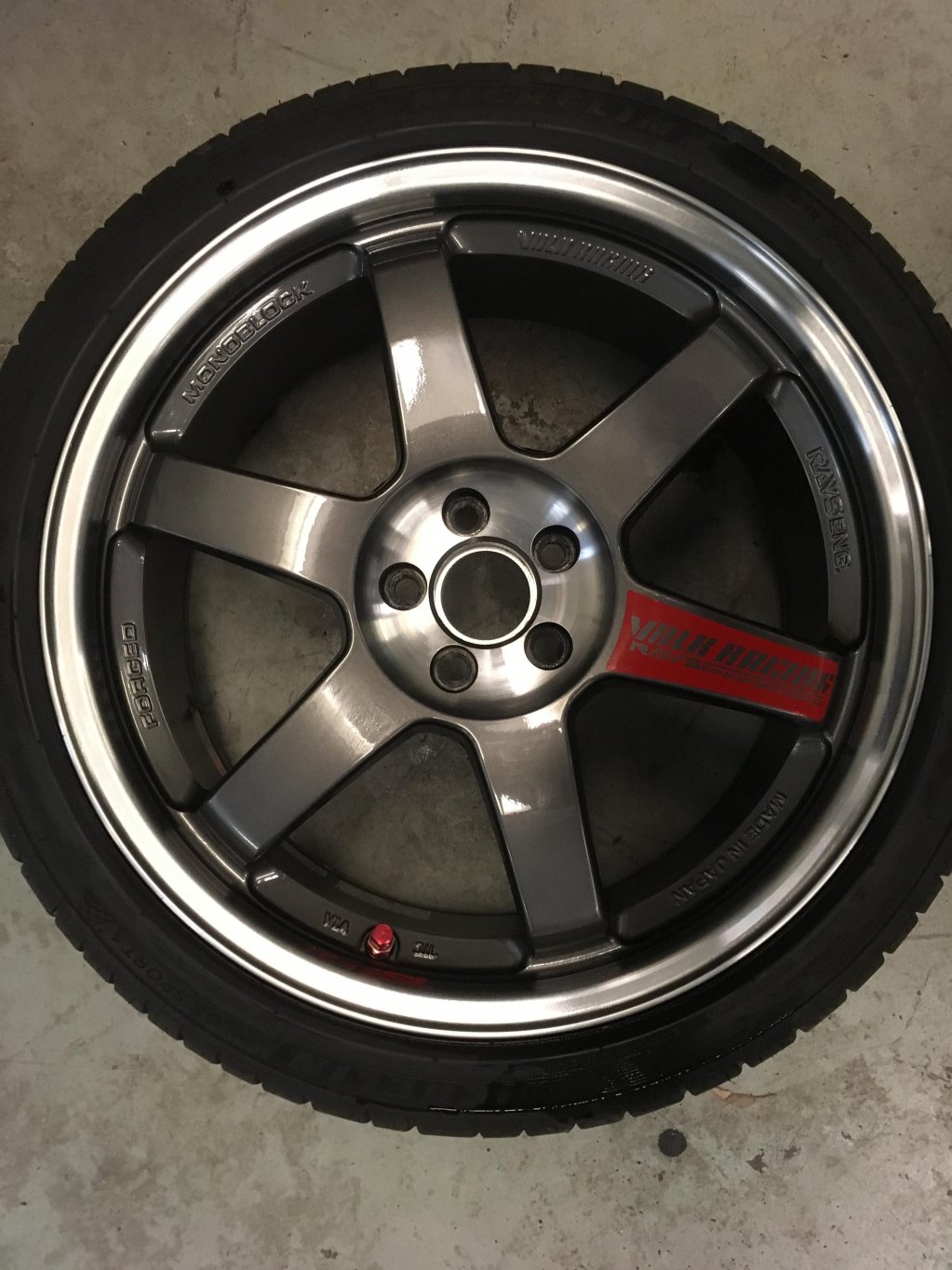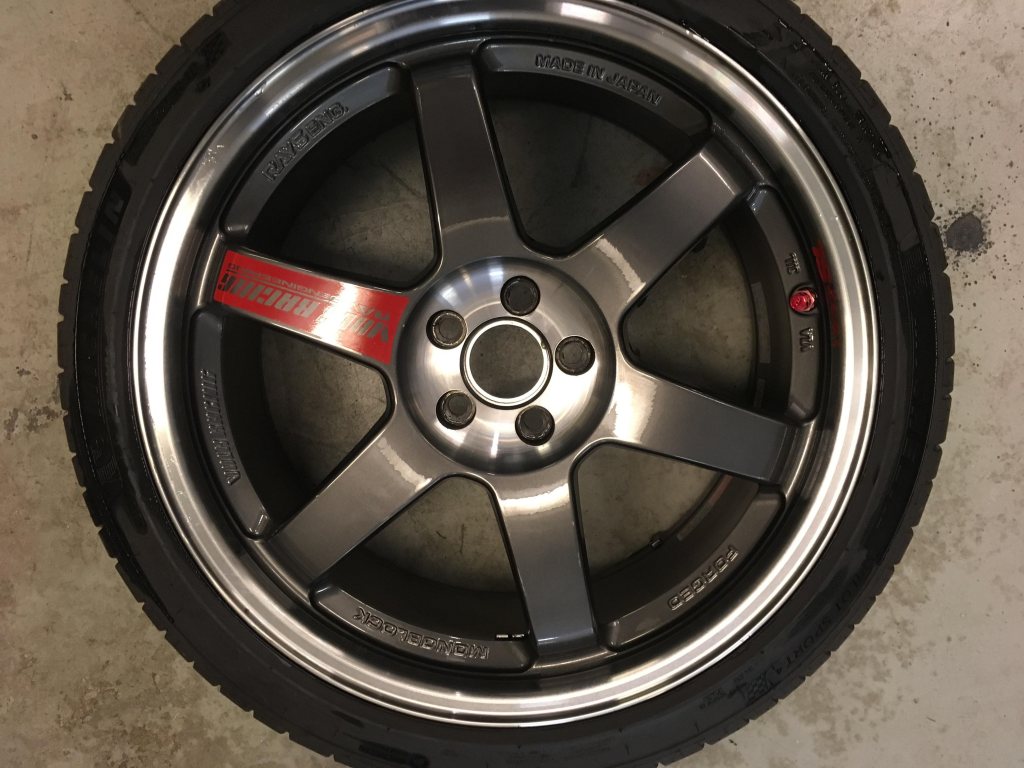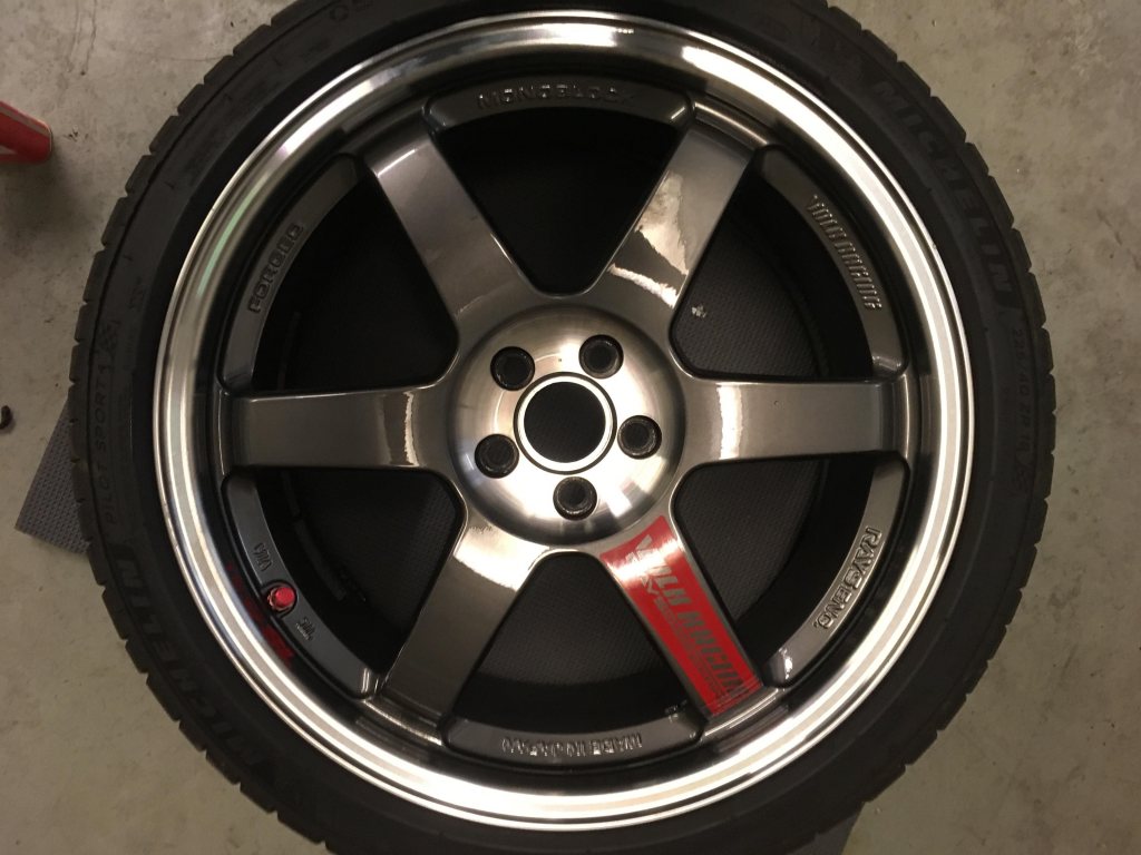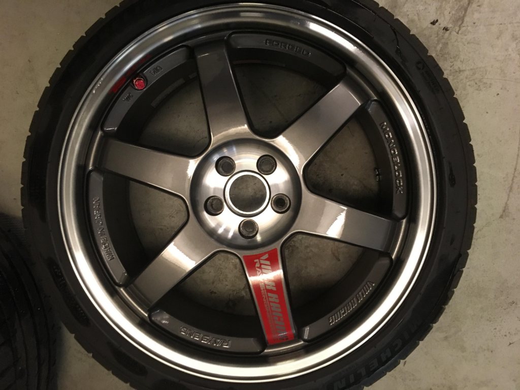 4st smidda Rays Volk te37 18x8,5 5x100 et35 centrumhål 65mm. Sitter idag ringar i metall på med innerdiameter 56,1mm. Fälgarna är i näst intill nyskick, en har lite skavmärken på en eker, se bild. På fälgarna sitter Michelin pilot sport 4, 225/40r18 tillverkade 0318, använda 100mil gata. Ingår: Lättviktsmuttrar med låsmutter från Rays m12x1,25mm Extra hjulmuttrar 21st m12x1,25mm Extra ventiler från Rays Dessa har suttit på en Toyota Gt86-13 Pris 25.000kr Nytt pris 15000kr!! Superdeal om man ändå behöver nya däck. Tel 07O4933657