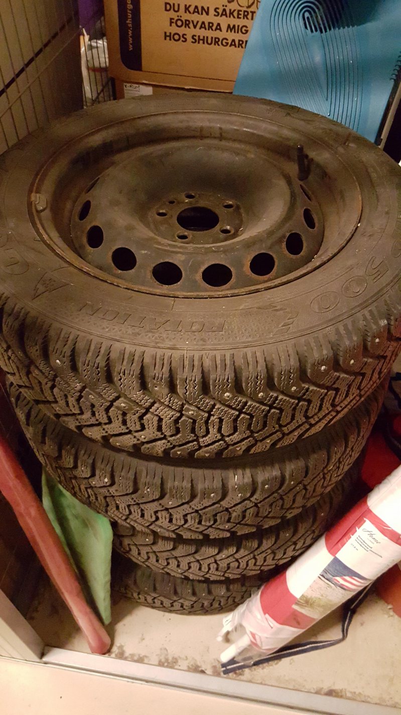 4 st 16" (tror jag) sommardäck på alufälg. Gamla. Punkt. Och skitiga, men hela och fina om man tvättar dem. 500 spänn.