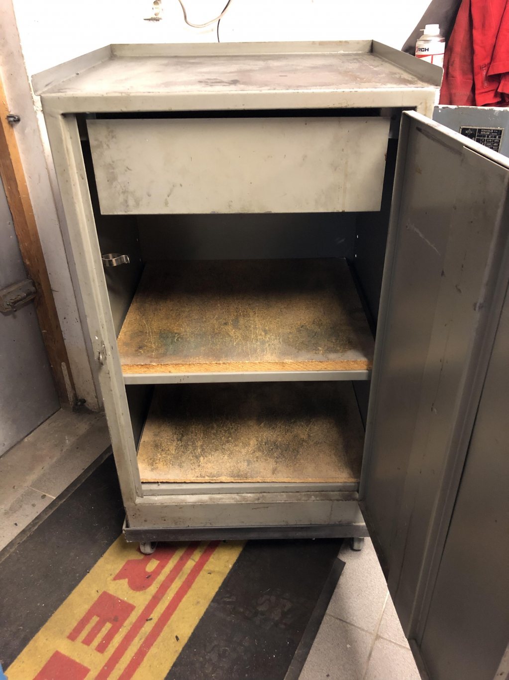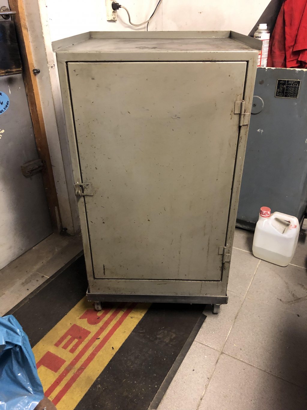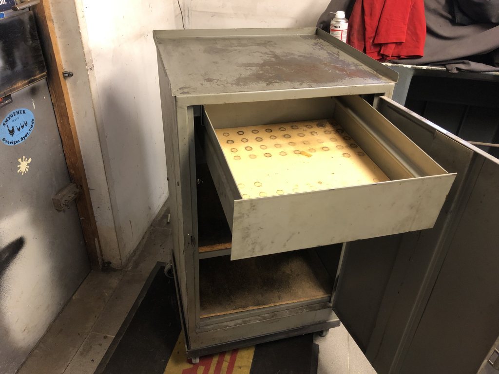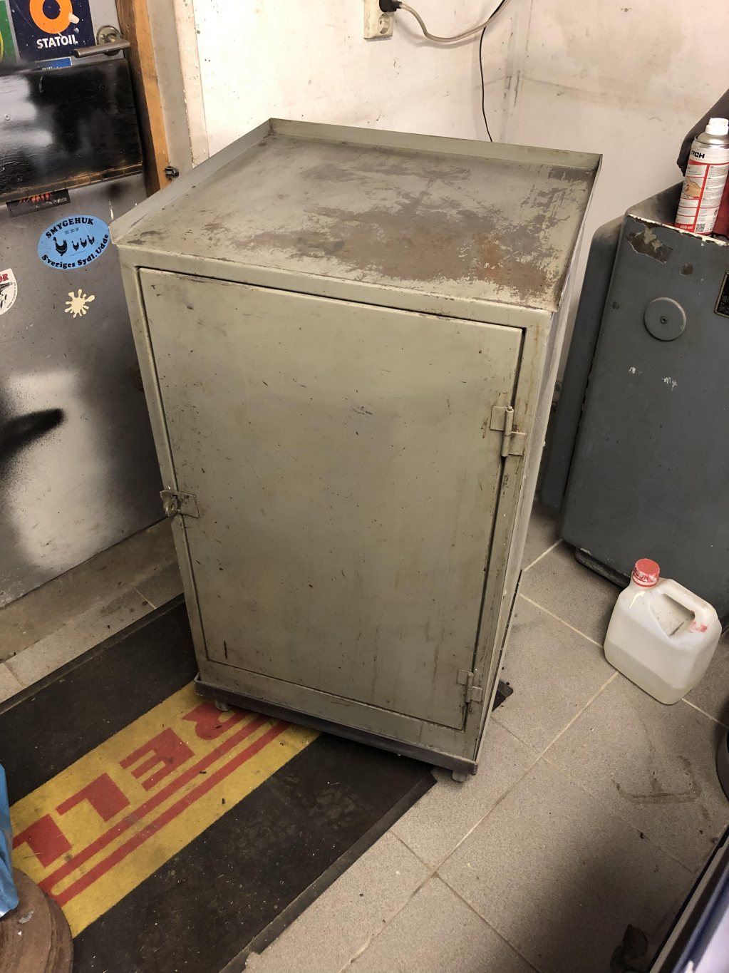 Plåtskåp enligt bilder , står på en bas med 4 snurrbara hjul. Har använt som förvaring av svarv-verktyg. 55 cm brett, 50 cm djupt och 103 cm högt (inkl hjul) Finns i Furulund 500:-