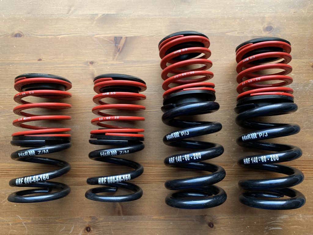 En uppsättning H&R HRF Racingfjädrar i mycket fint skick Huvudfjäder Fram: HRF 140-60-200 Bak: HRF 080-60-160 Hjälpfjäder HR 080-60-20