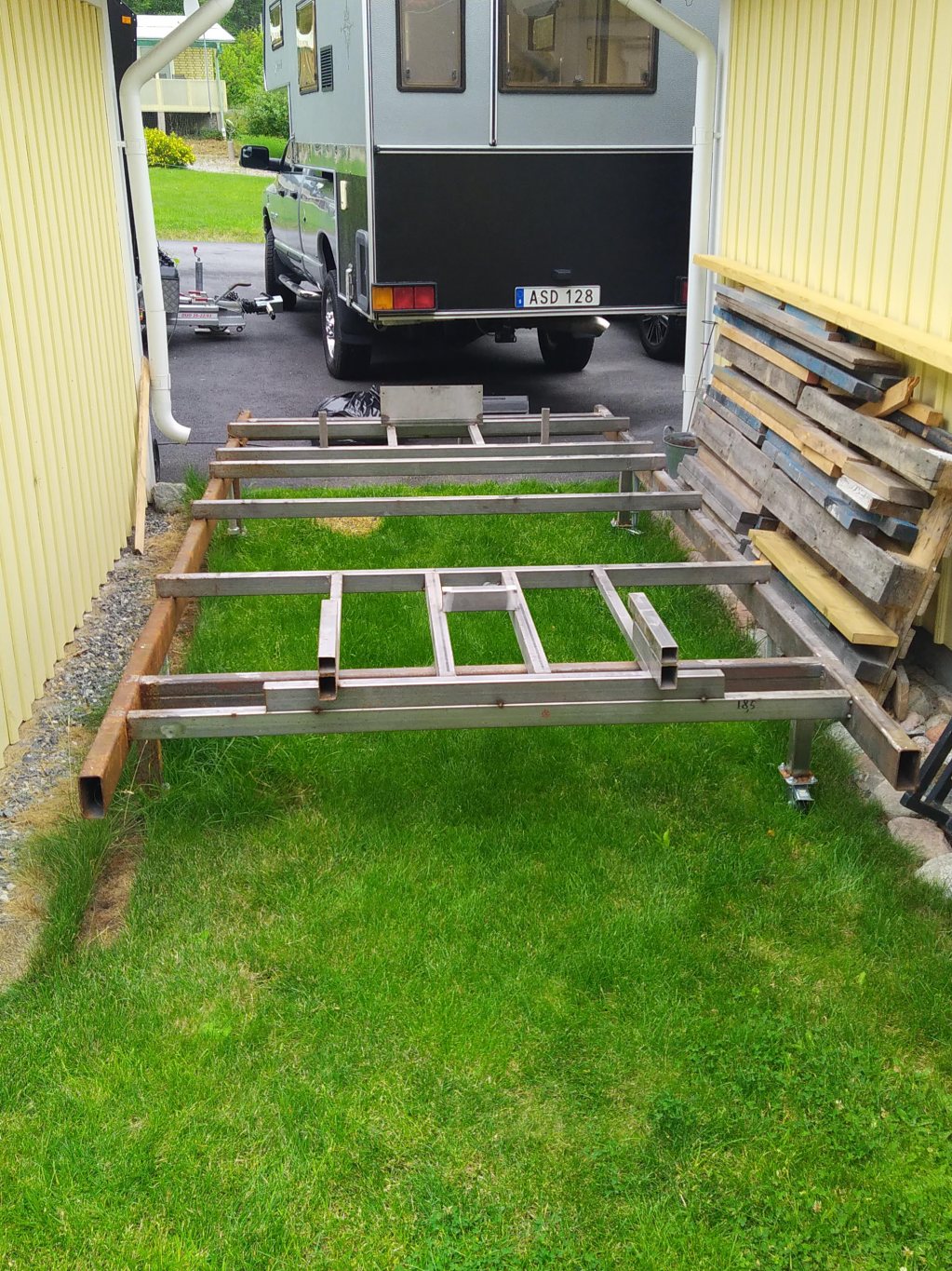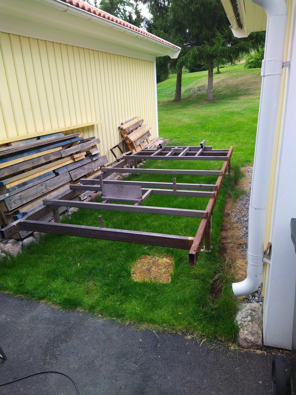 Med hjul. Ramen är helsvetsad. Övrigt balkar är bara punkt svetsade.