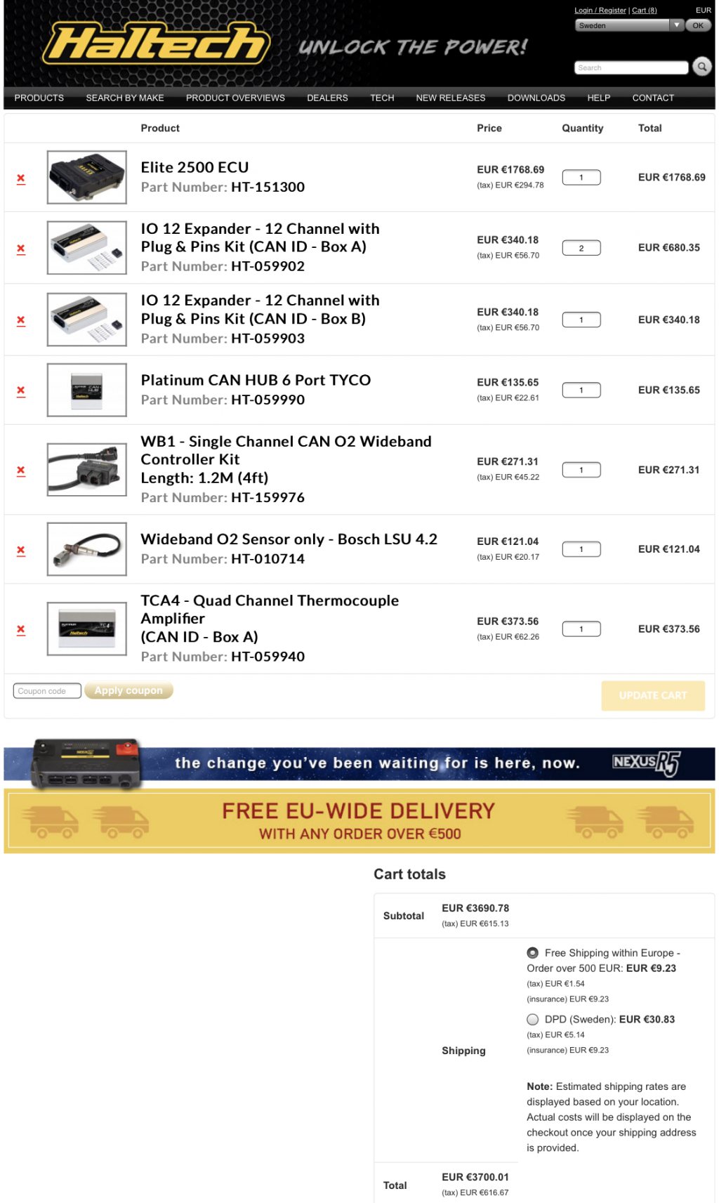 Haltech Elite 2500 till salu. Full fungerande såklart. Sitter i bilen nu och kan ses live en liten stund till för den som väljer hämta det på plats. Väldigt komplett kitt, 2st i/o12 boxar, avgastemp box, bredbandslambda och canbus hub. Det här är kittet för dig som vill koppla in precis allt och styra mycket roligt med sprutet. Haltech har en extremt välutvecklad och lätt lärd mjukvara. Kört detta på min s54 turbo. Nypris hos Haltech idag 38000kr, så som de ligger I inkorgen är så som det levereras. Behöver kompletteras med kabelstam av önskad modell för ditt ändamål, avgastempgivare och övriga sensorer. Lambdasond följer med. OBS den silvriga lambdaboxen för en sensor. Skänker bort allt för 27000kr Erbjuder även viss support till den som köper det. Har 14 års erfarenhet av Haltech!