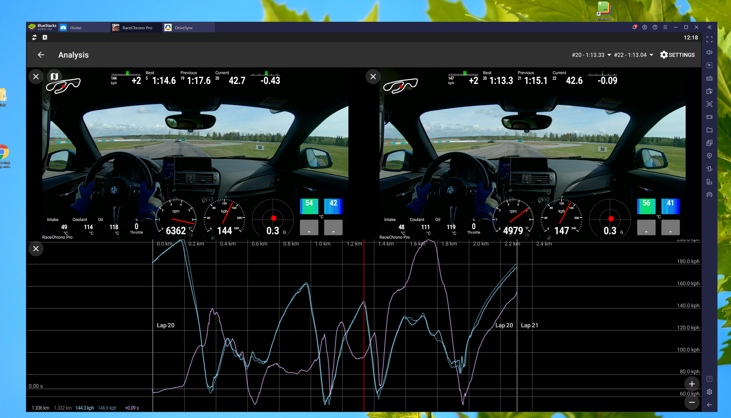 För att få en stor skärm när man sitter och kikar på loggar och video så är det najs att sitta på datorn. RaceChrono finns inte för Windows egentligen men du kan köra RaceChronos Androidapp med en emulator på Windows, jag kör med Bluestacks. Funkar utmärkt, ja videon är mer för stillbilder kanske speciellt, om man kör alltför högupplöst
