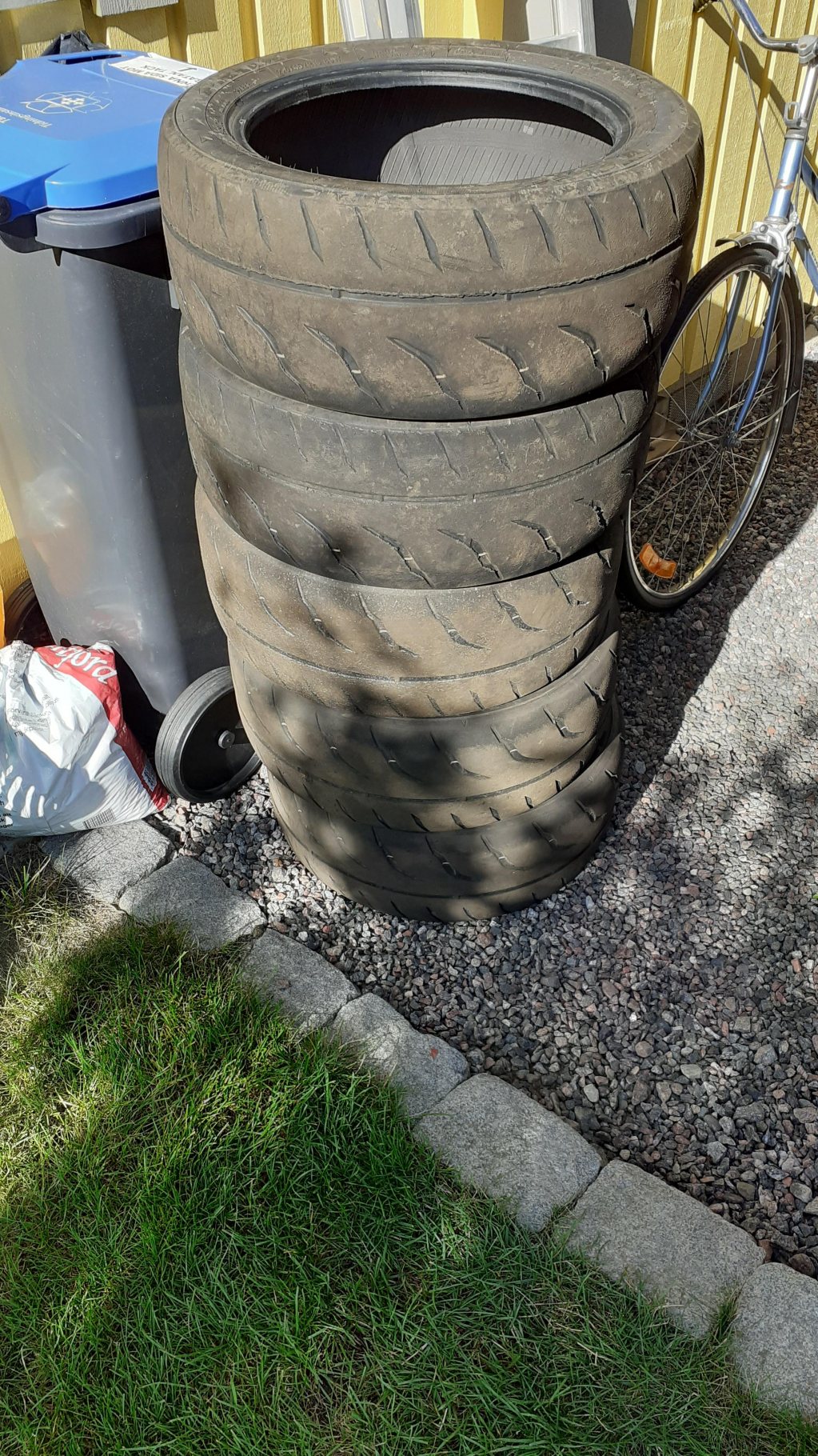 5 st begagnade Toyo R888 225/45ZR16 89W 2-3 mm mönsterdjup och ytterligare minst 3 mm till innan korden kommer fram ;-) 1200 för alla 5 däcken.
